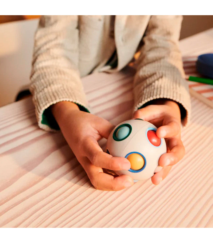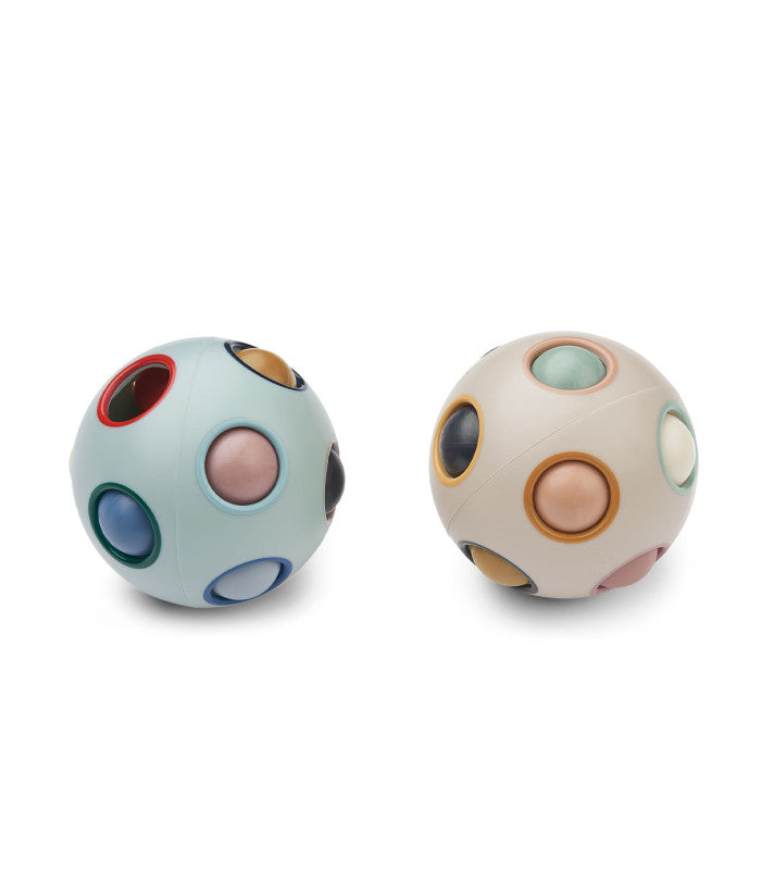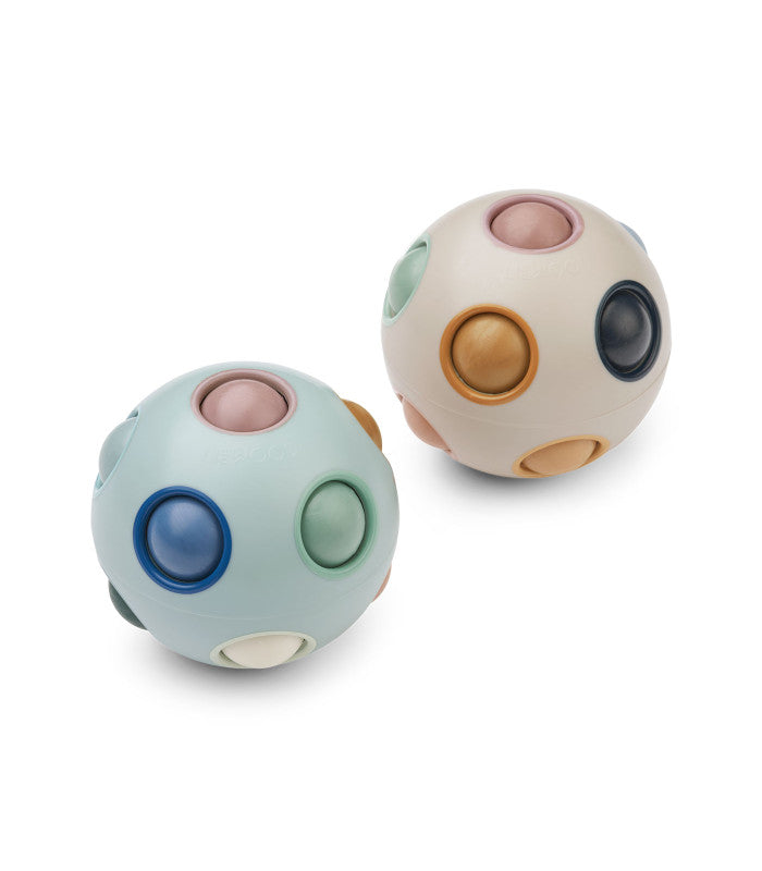 Las 2 bolas rompecabezas Solene de Liewood en Ice Blue Multi Mix diseñadas para rodar y mover pequeñas bolas de colores del mismo color que el anillo. Ayuda a entrenar la motricidad fina y el reconocimiento de colores. Ideal para un juego concentrado e inmersivo.