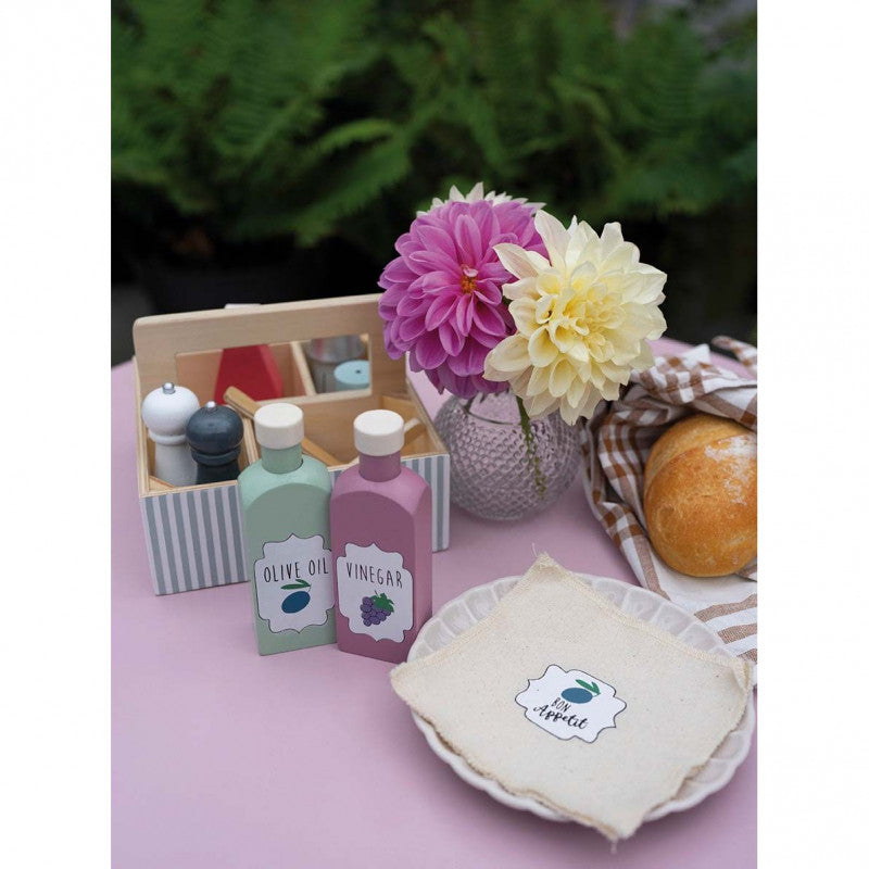 Kit de accesorios de madera en una pequeña caja compartimentada con asa:.
