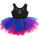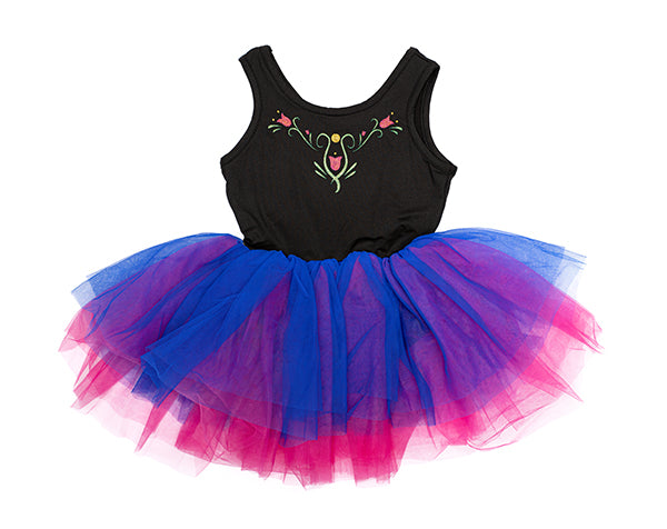 Tutu inspirado en Anna con cuerpo negro y falda de tul azul vibrante, combinando encanto y movimiento. Cómodo y divertido para horas de juego imaginativo.
