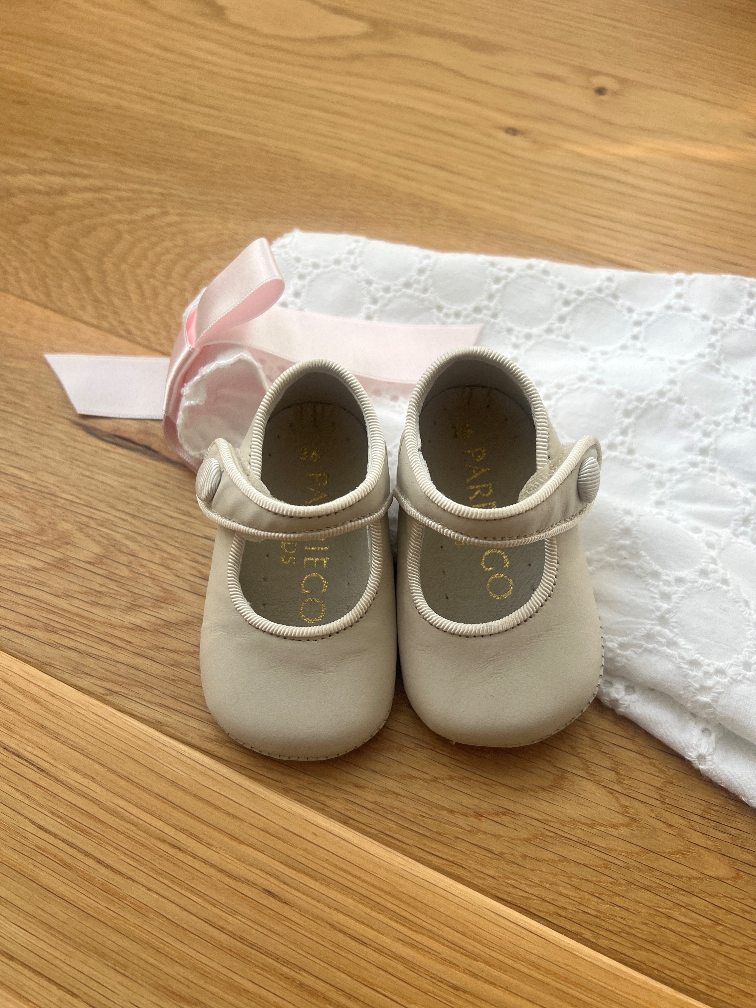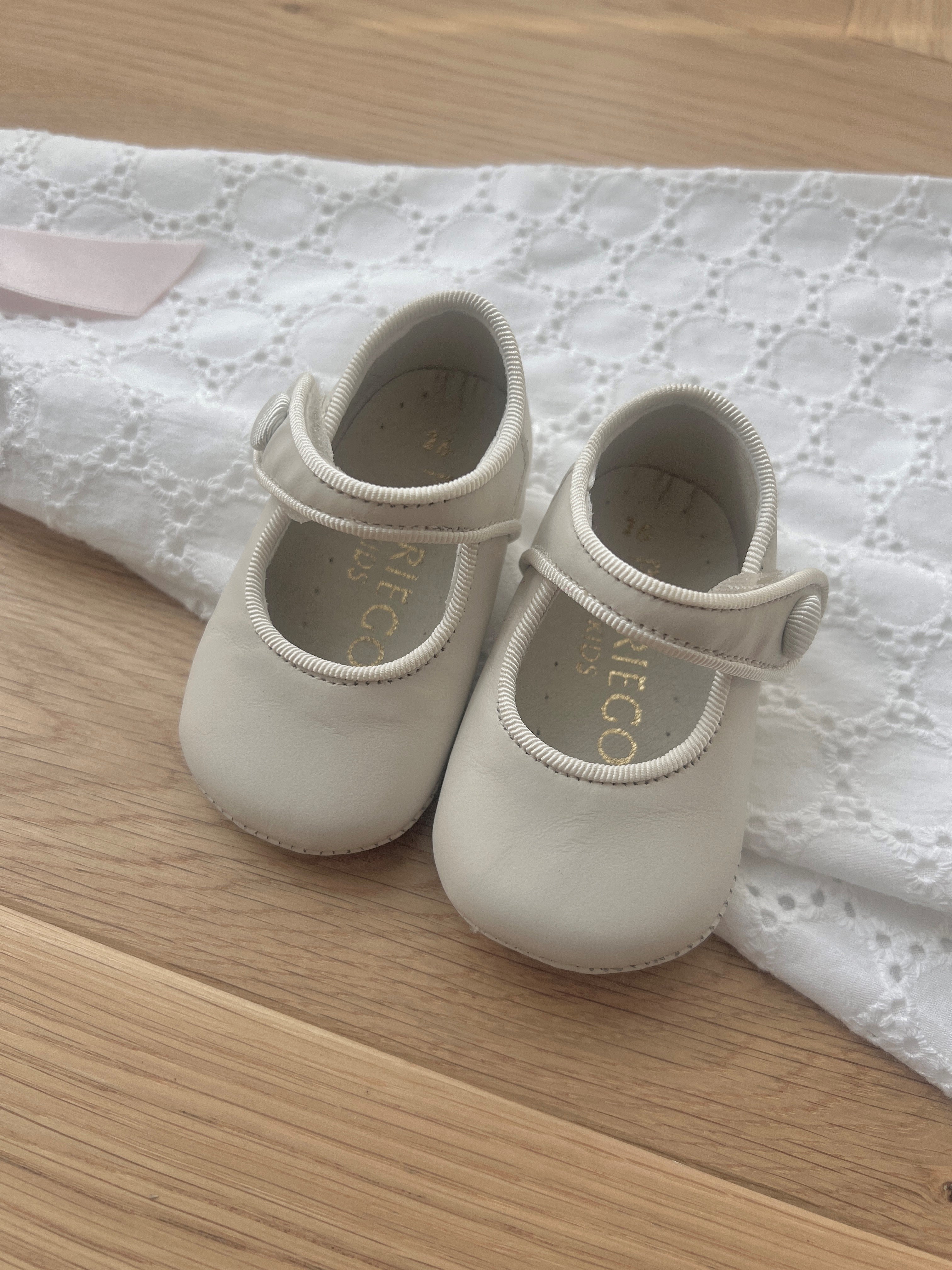 Están disponibles desde la talla 16 hasta la 19 en un serraje color rosa antique precioso y una napa muy suave en blanco roto y verde agua. Tallan bien, por lo que recomendamos comprar su número habitual. Si no sabes qué talla tiene tu bebé, en general se recomienda una talla 16 para los tres primeros meses de vida, la 17 hasta los 6 meses, la 18 hasta los 9 meses y la 19 a partir de los 9 meses, pero evidentemente dependerá de cada bebé y su estatura y peso.