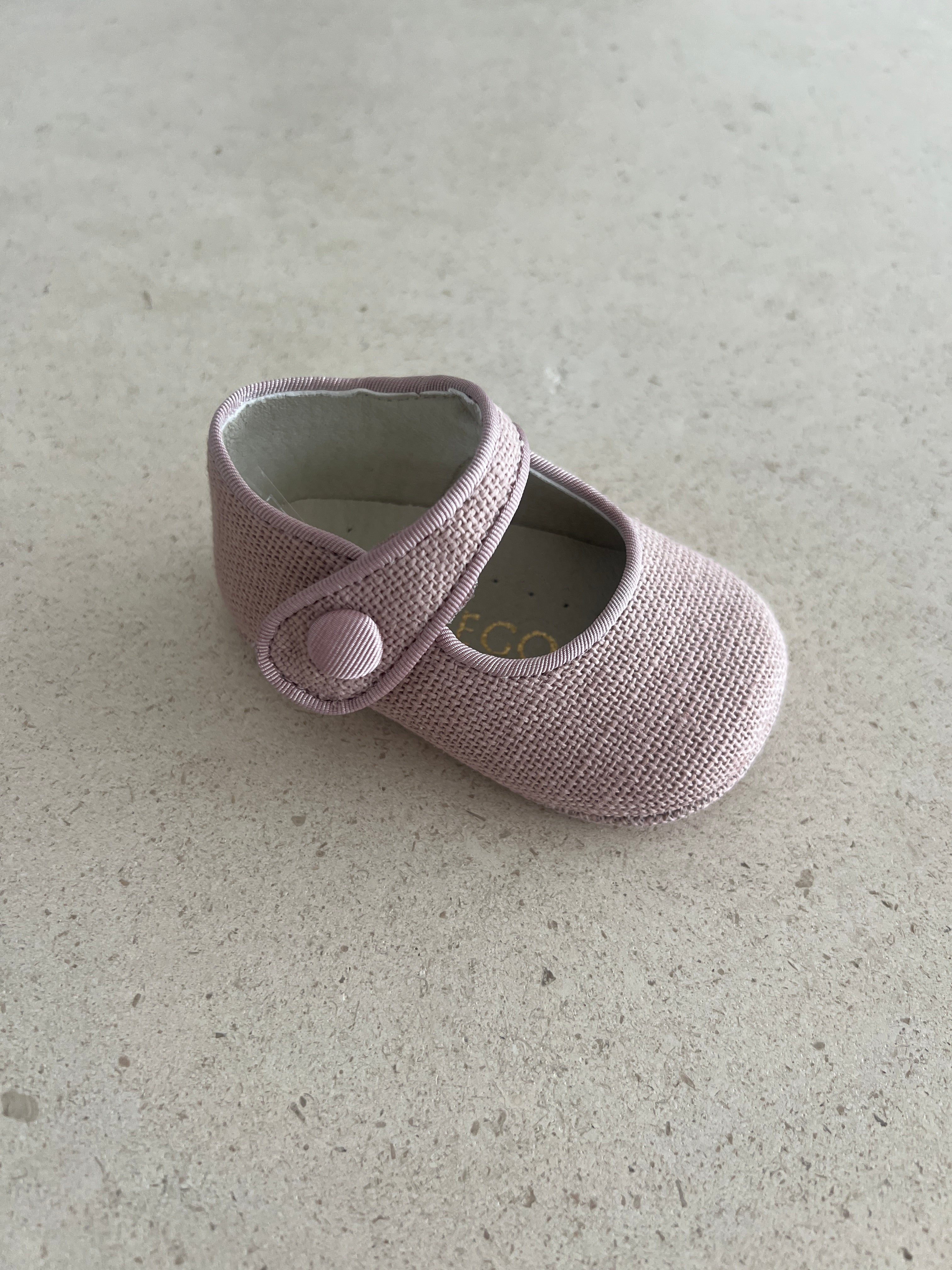 Mercedita sin suela para bebé de lino color rosa y cierre de velcro con falso botón.