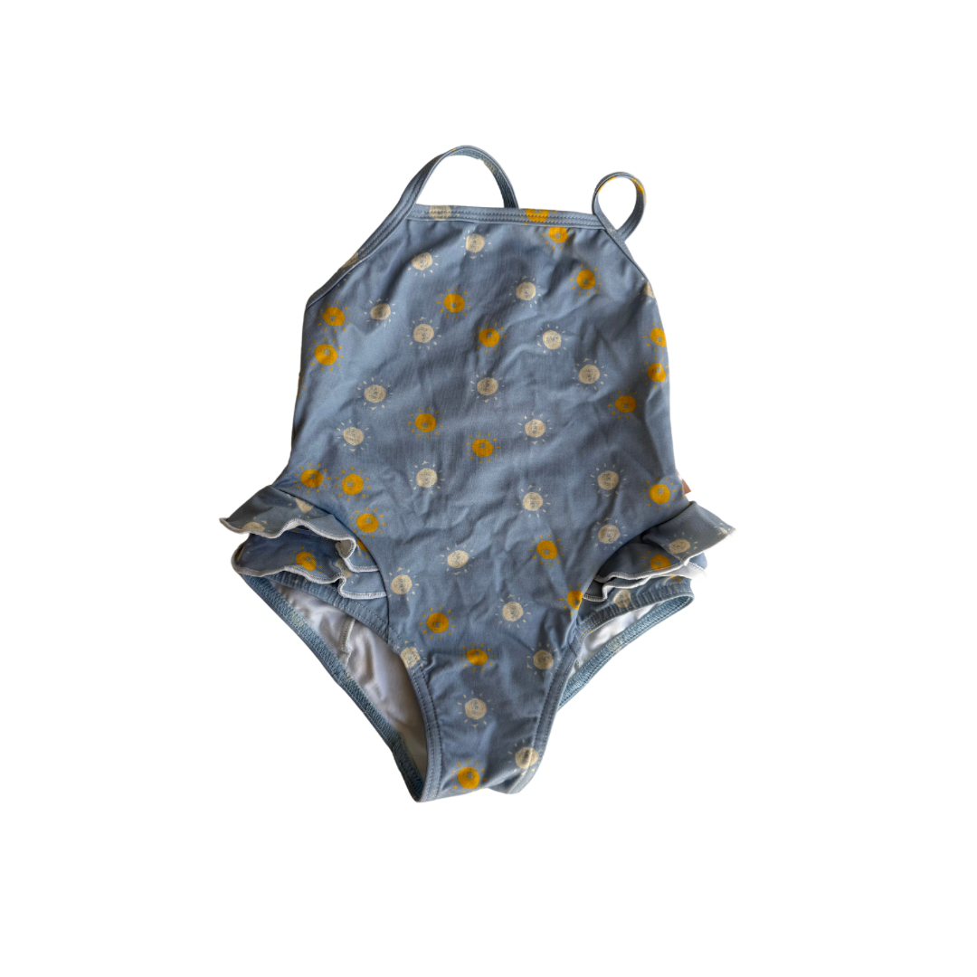 Bañador de niña con estampado de soles blancos y amarillos. Diseño exclusivo y propio.