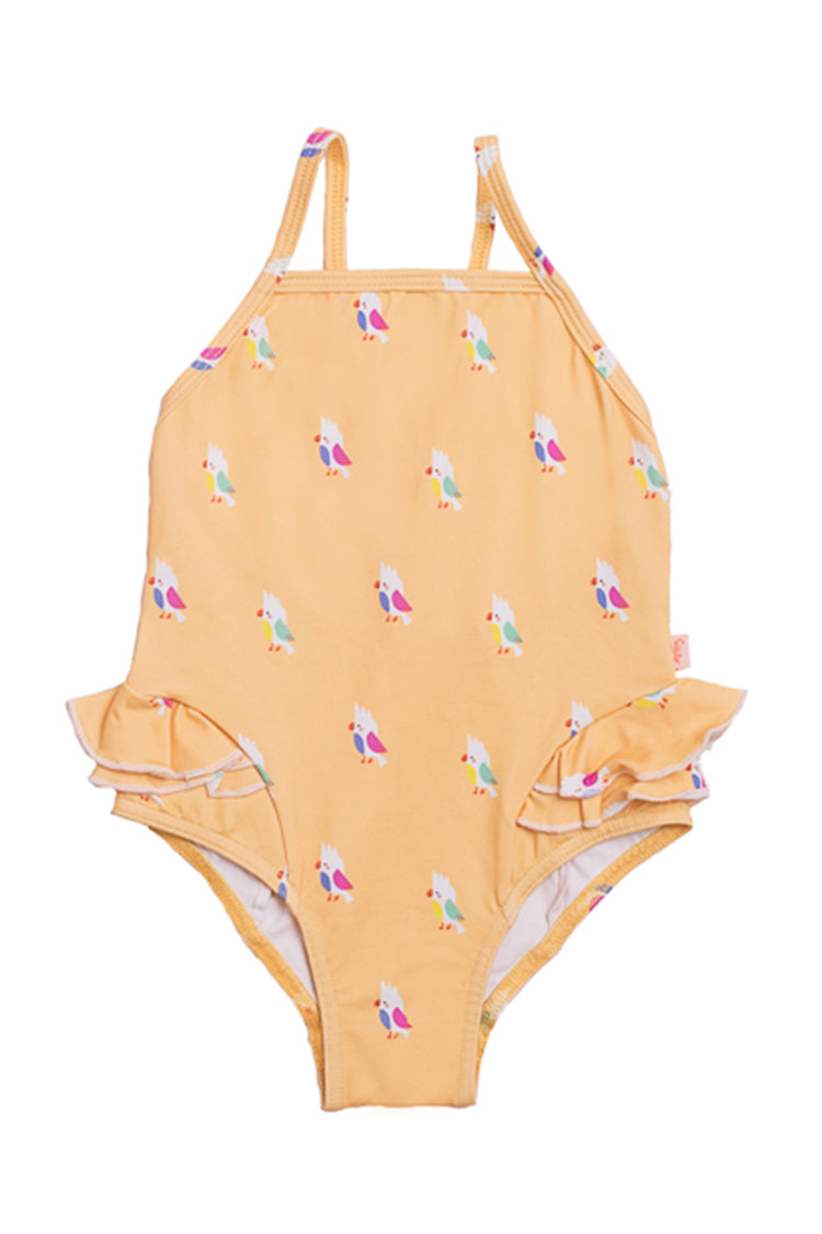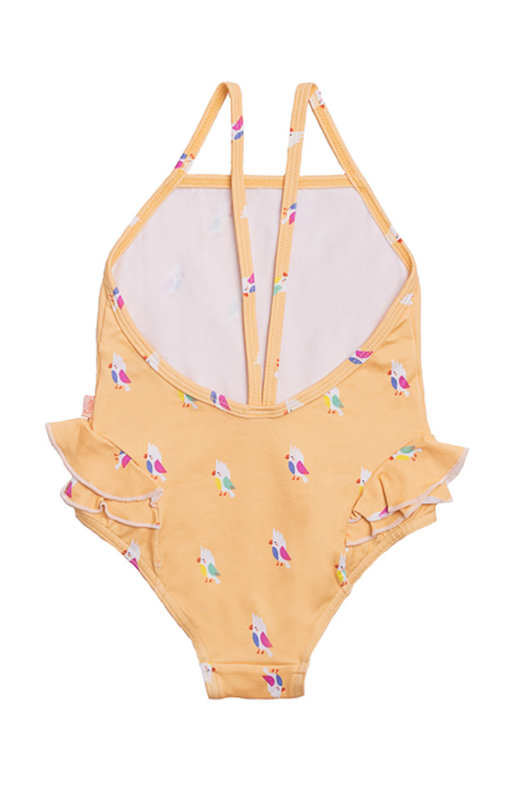 Bañador de niña con estampado de cacatúas sobre fondo amarillo. Diseño exclusivo y propio. Detalle de volantes laterales con remate en color claro. Tirantes finos.