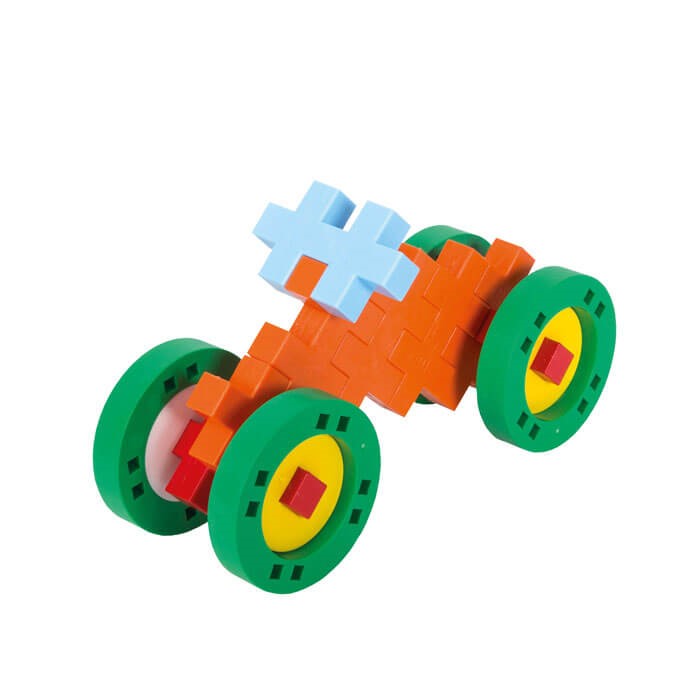 Contenido: 25 piezas grandes de colores, 1 plancha de montaje, 4 ruedas BIG y 1 guía de