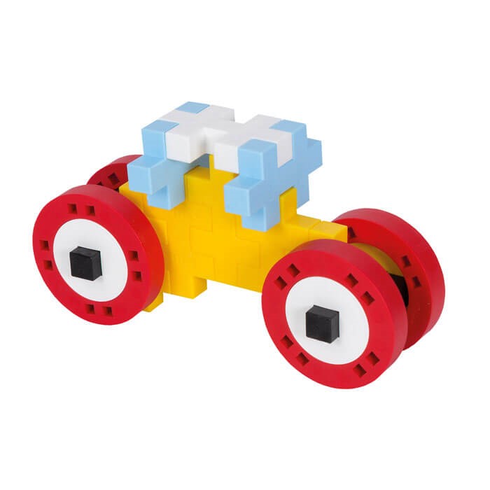 Perfecto para pequeñas manos y grandes ideas. Cuatro ruedas y una plancha de montaje para construir tus propios vehículos y después, poder jugar con ellos.
