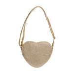 ¡Este bolso en forma de corazón hará latir más fuerte los corazones más pequeños! Confeccionado en un precioso glitter dorado y acabado PU, es adorable en cada detalle. Cuenta con cierre de cremallera, forro interior con topitos dorados y una correa dorada ajustable con punto de seguridad.