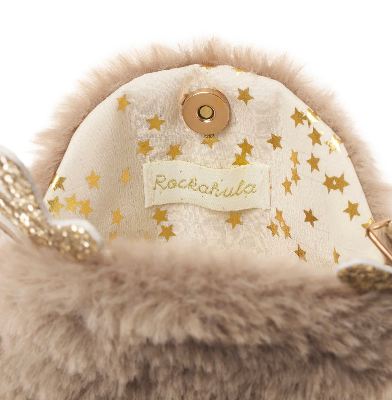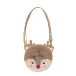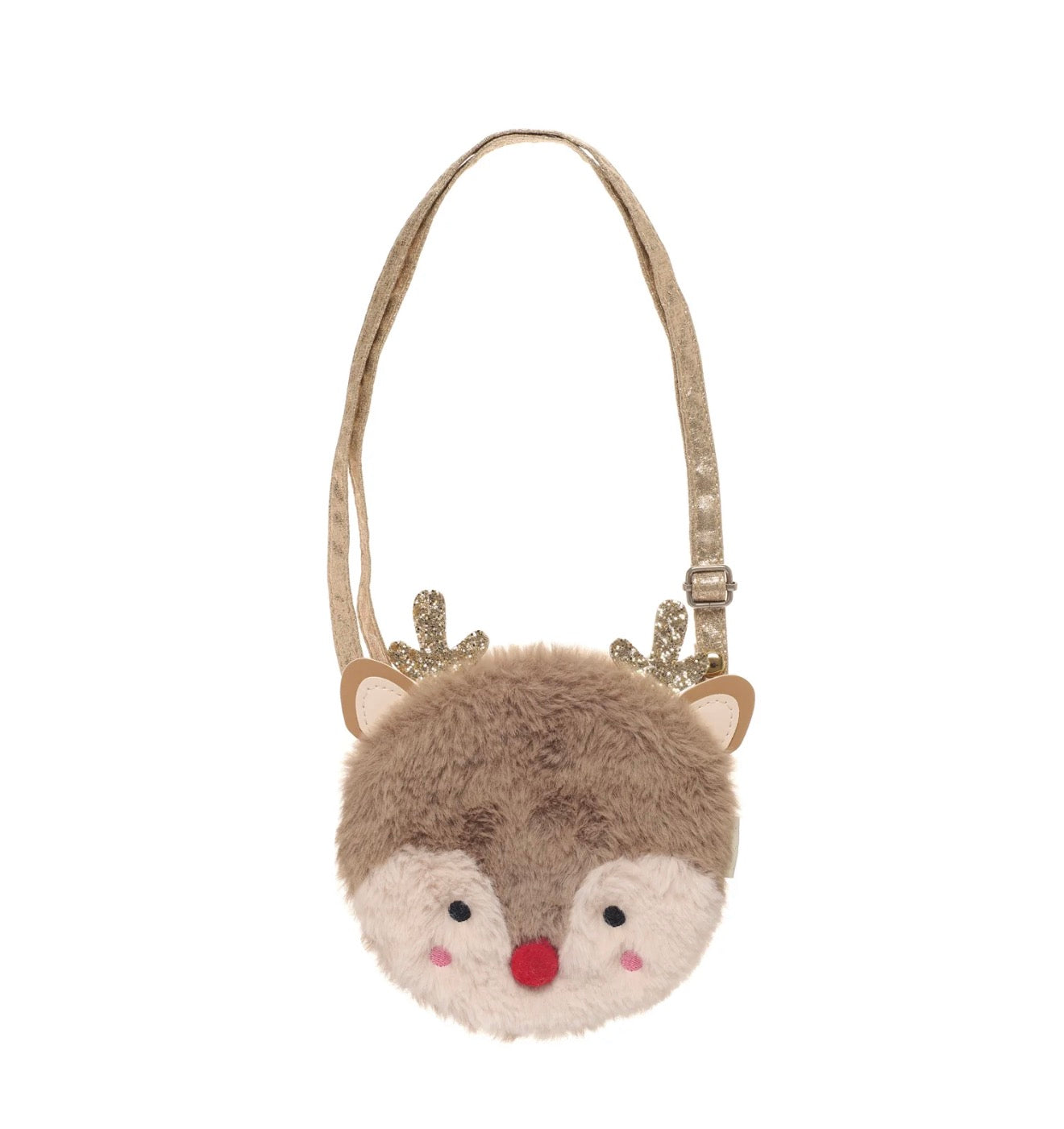 ¡Este acogedor bolsito de reno es perfecto para guardar todo tipo de golosinas navideñas! Confeccionado con la piel sintética más suave en color marrón, con astas doradas brillantes y una nariz de pompón rojo cereza. Totalmente forrado con tela de estrellas doradas, este bolso peludito cuenta con cierre de imán y una correa dorada con punto de liberación para mayor seguridad.