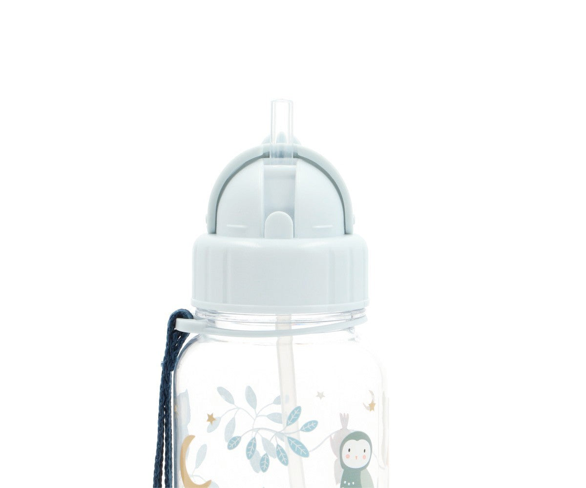 Botella de plástico tritán. La botella tiene una pajita de silicona abatible que sale automáticamente cuando se abre la tapa y es ideal para llevar al cole. Tiene un asa larga que permite llevarla colgada en la mochila o en el carro del bebé.