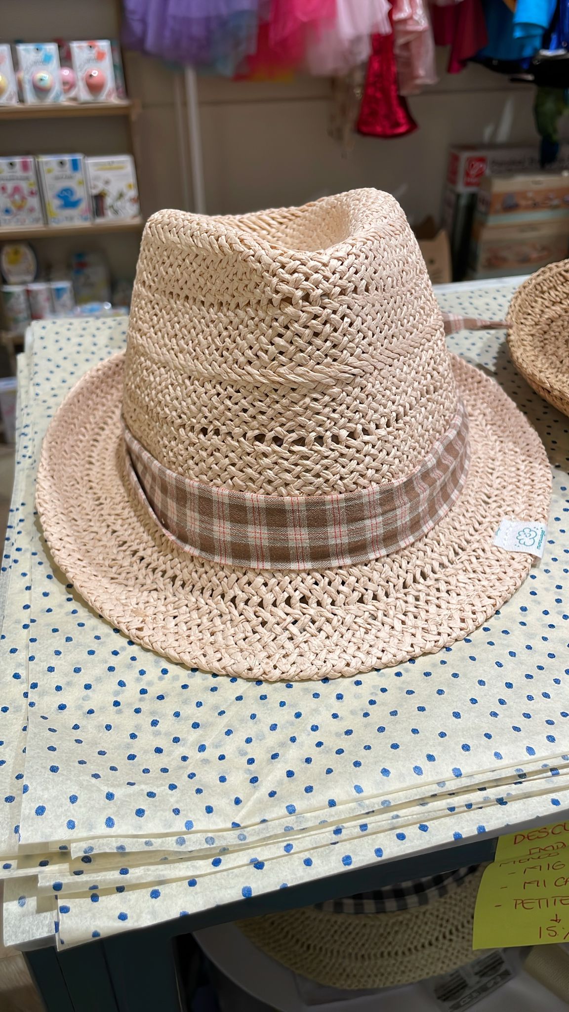 Sombrero hecho de fibras vegetales en color rosa con cinta de tela en cuadro vichy rosa a juego. El complemento para este verano que puedes combinar con cualquier look. Disponible en talla 50/52cm.
