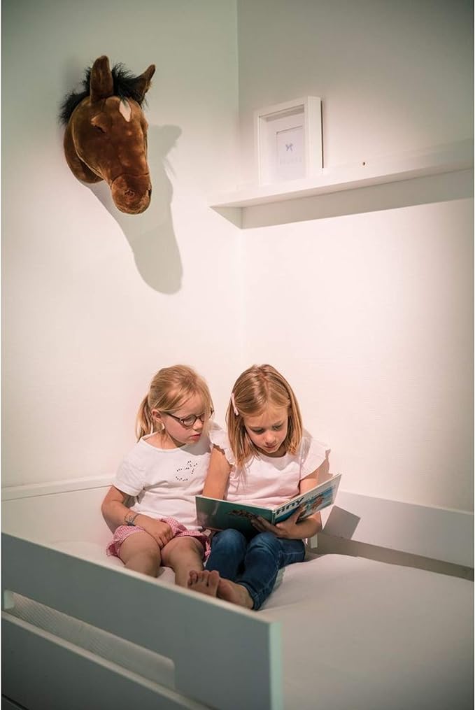 Cabeza de peluche para colgar en la pared del cuarto de los más peques. Con este adorno el pequeño de la casa imaginará las aventuras más emocionantes que se le ocurran. Es perfecto para los niños a los que les gusten los peluches y los animales ya que esta cabeza decora la habitación tal y como a ellos les gusta y les hace sentir cómodos. Es muy fácil de colgar ya que dispone de un gancho en la parte posterior.