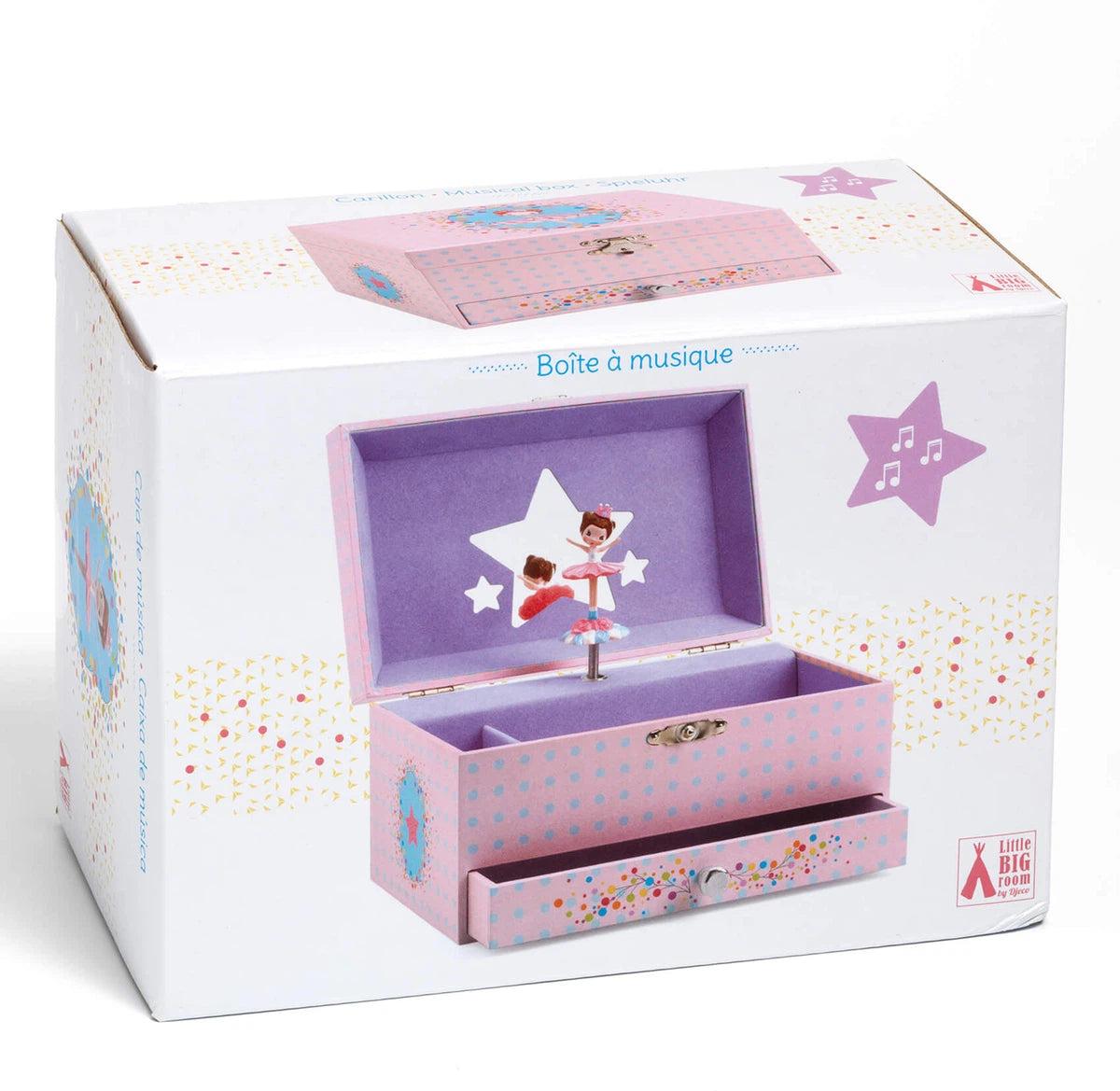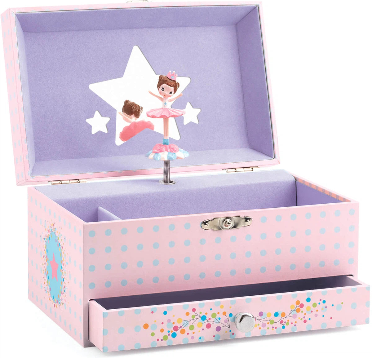 -La mélodie de la ballerine es una caja de música con un cajón para guardar joyas y secretos. Gira la manivela, abre la caja y... ¡sorpresa!: una bailarina finamente esculpida gira y se refleja en un espejo siluetado al son de la música Invitación a la danza de Carl Maria Von Weber.