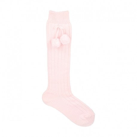 Calcetines altos de algodón cálido, largos por debajo de la rodilla y canalé con borlas a tono. Disponibles en tallas de 000 a 8 años.