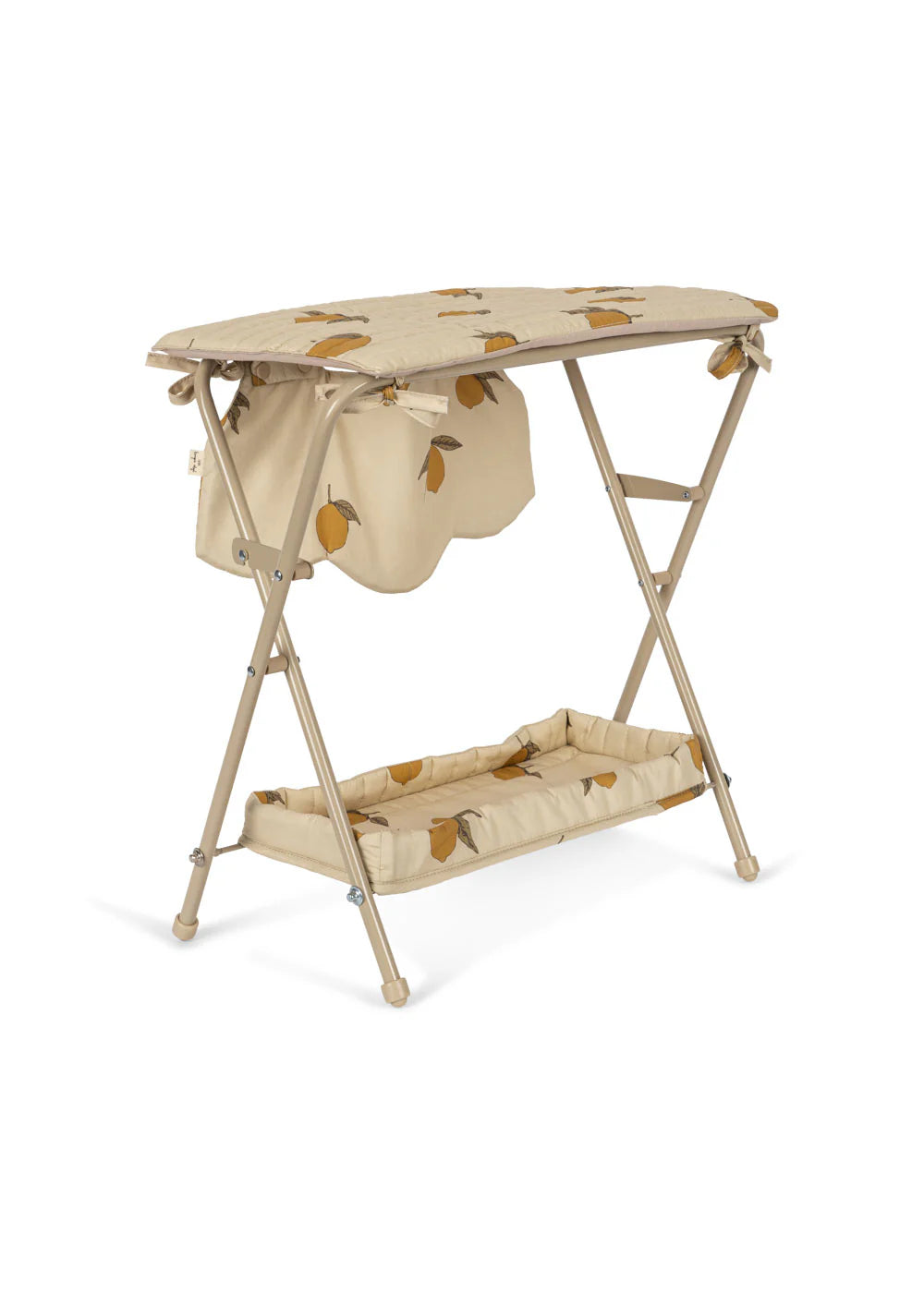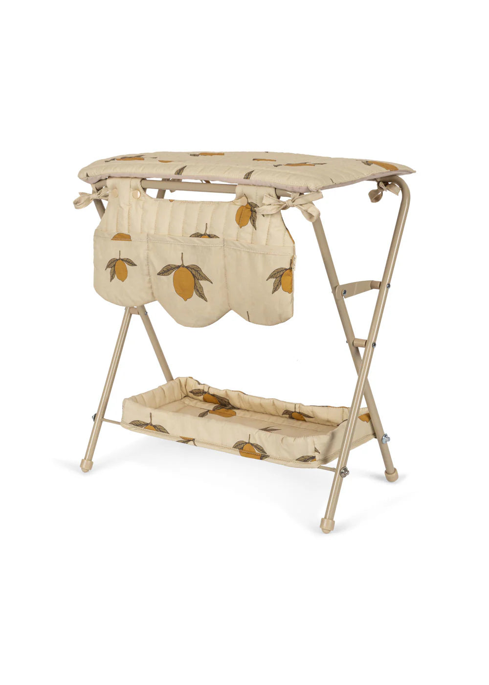 Cambiador de muñecas con estructura de metal robusto y mesa de suave algodón. Mucho espacio para guardar los suministros de tu muñeca debajo y en los bolsillos laterales. Diseñado con terminaciones festoneadas.