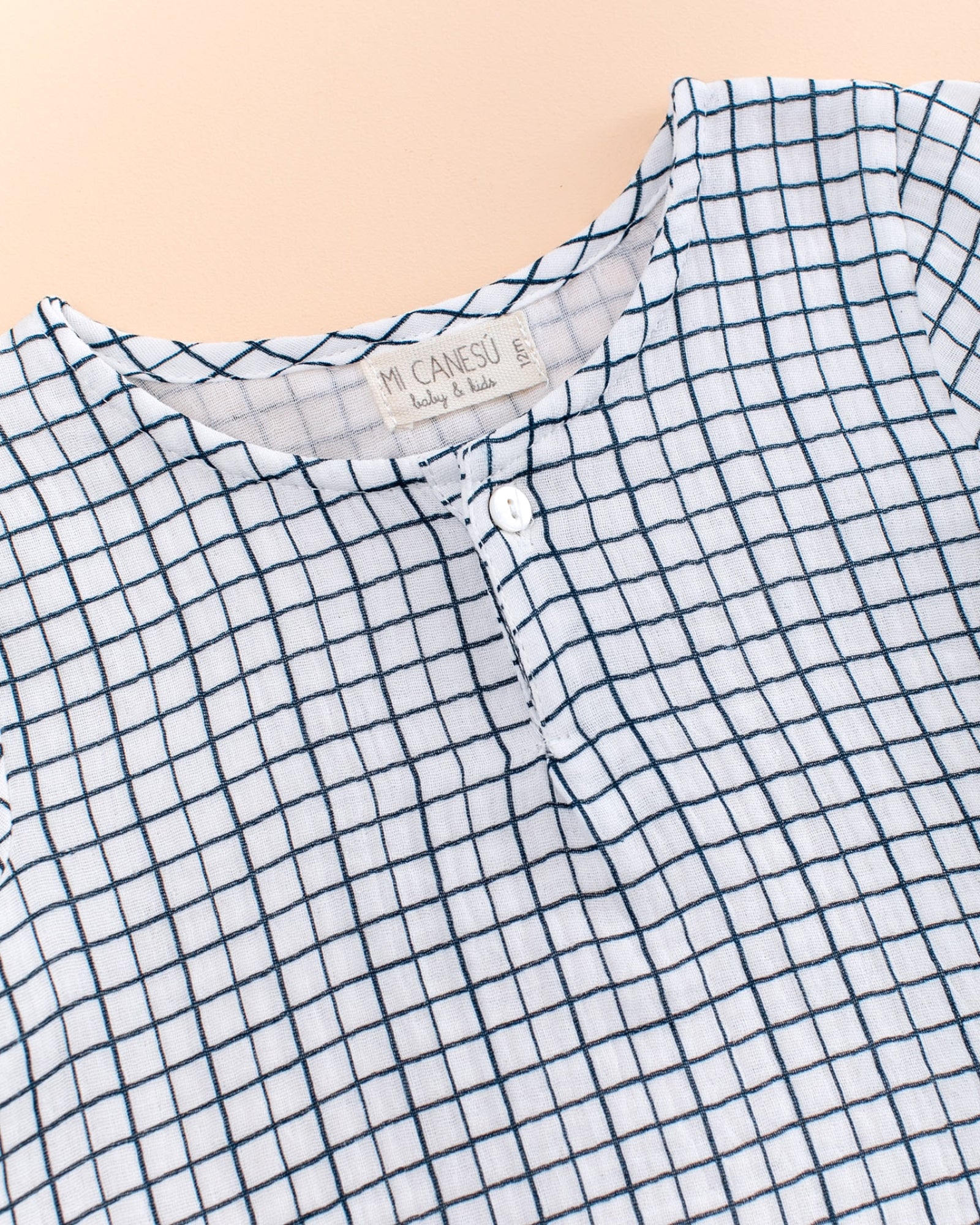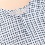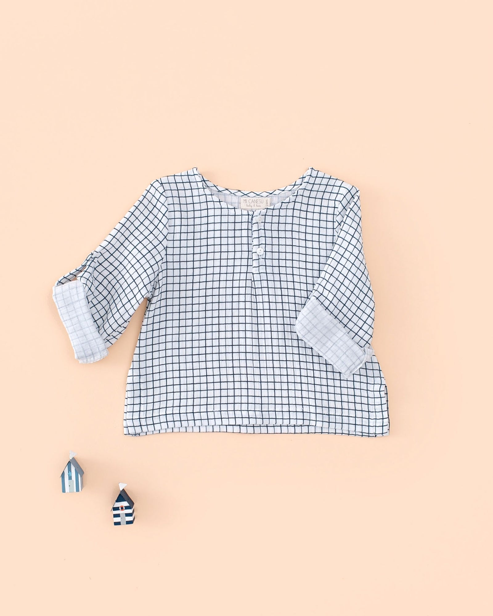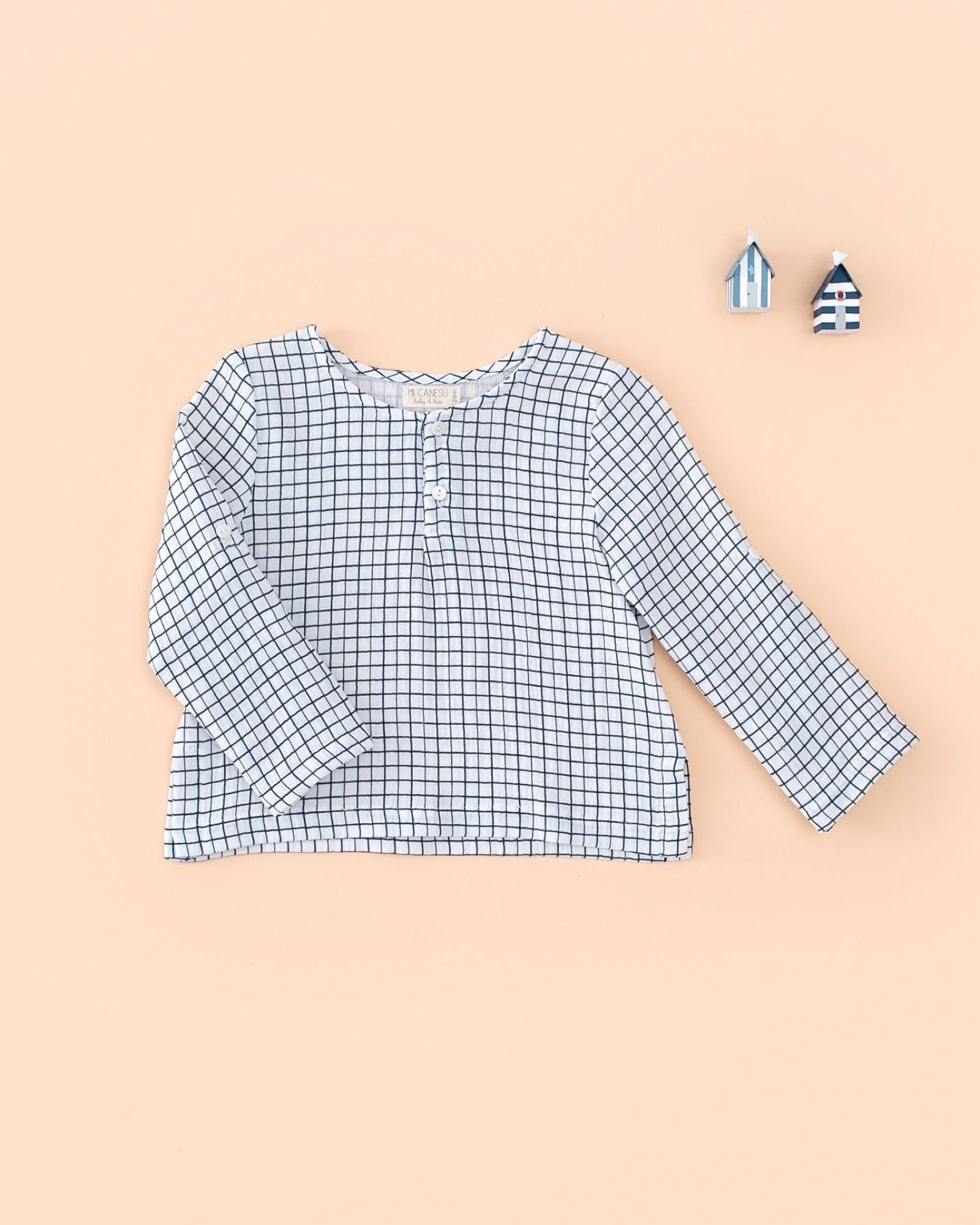 Camisa de pinzas bajo el pecho en tejido de gasa Cuadrito Begur. Es unisex. Lleva dos botones en la parte delantera para que sea mas fácil de quitar y poner. La pinza que tiene la hacen más cómoda ya que así no se ajusta al cuerpo. Lleva trabilla en la parte interior de las mangas para poder remangarlas y abotonarla en la parte exterior.