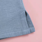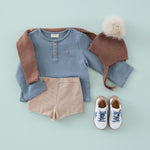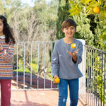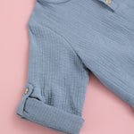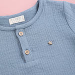 Camisa de niño en manga larga confeccionada con nuestro tejido Twin Plomo. Camisa con cuello a la caja y lleva dos botones de madera en la parte delantera. Ideal para el día a día y también perfecta para usar en ocasiones especiales coordinada con el resto de prendas de nuestra colección.