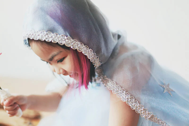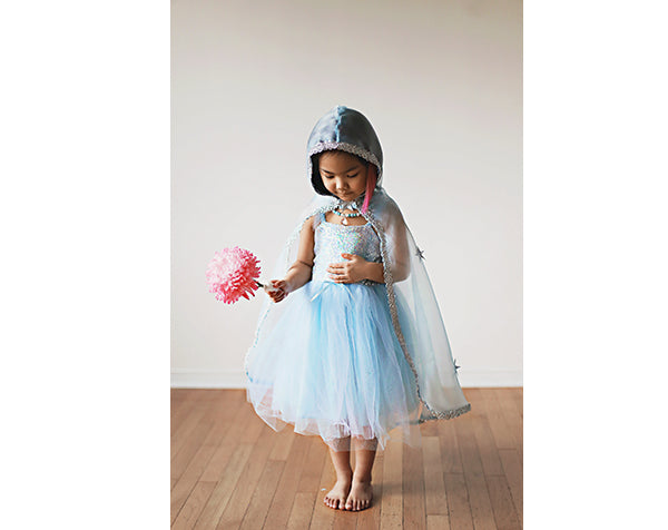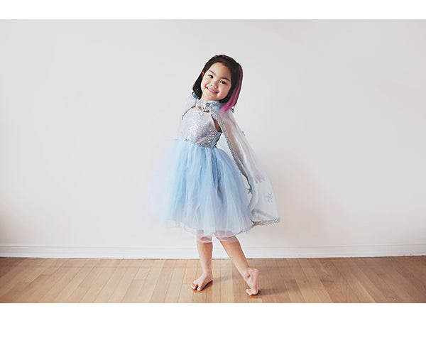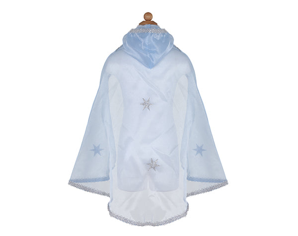 Capa de organza cristalina azul con grandes estrellas plateadas brillantes y capucha amplia. Evoca escenarios helados con un estilo elegante de reina invernal.