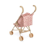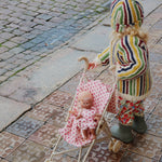 Cochecito para muñecas diseñado con arnés, bolsa de transporte y ruedas dobles en las cuatro patas para mayor estabilidad. Cuenta con tejido extraíble. Viene completamente ensamblado. Fácil de plegar y guardar. La estructura está hecha de hierro con asas suaves y esponjosas.