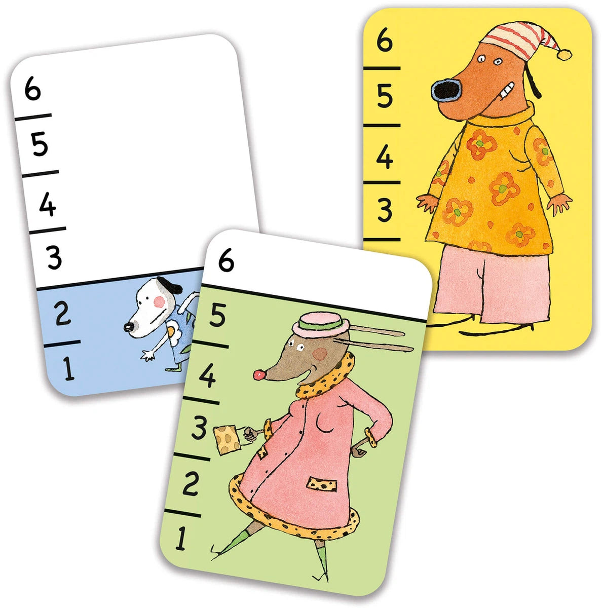 -Cartas graduadas de 1 a 6. Para los más pequeños, no hay necesidad de saber contar, ¡basta con comparar el tamaño de los perros!