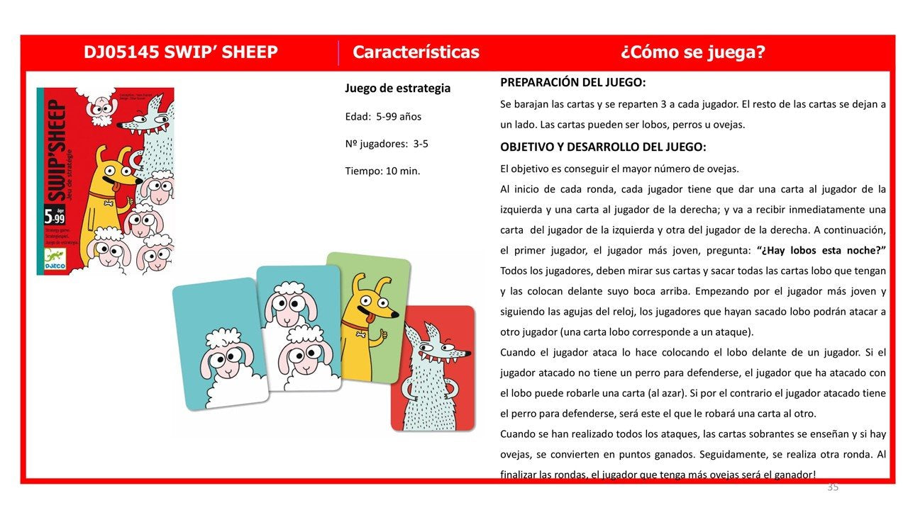 -Un juego de estrategia de 3 a 5 jugadores en el que hay que combatir los ataques de los lobos y salvar a las ovejas. Los lobos atacan, los perros defienden y las ovejas confieren puntos. ¡Hay que conservar las que se tiene y conseguir las de los adversarios! Al final de las bazas, quien haya ganado el mayor número de ovejas gana.