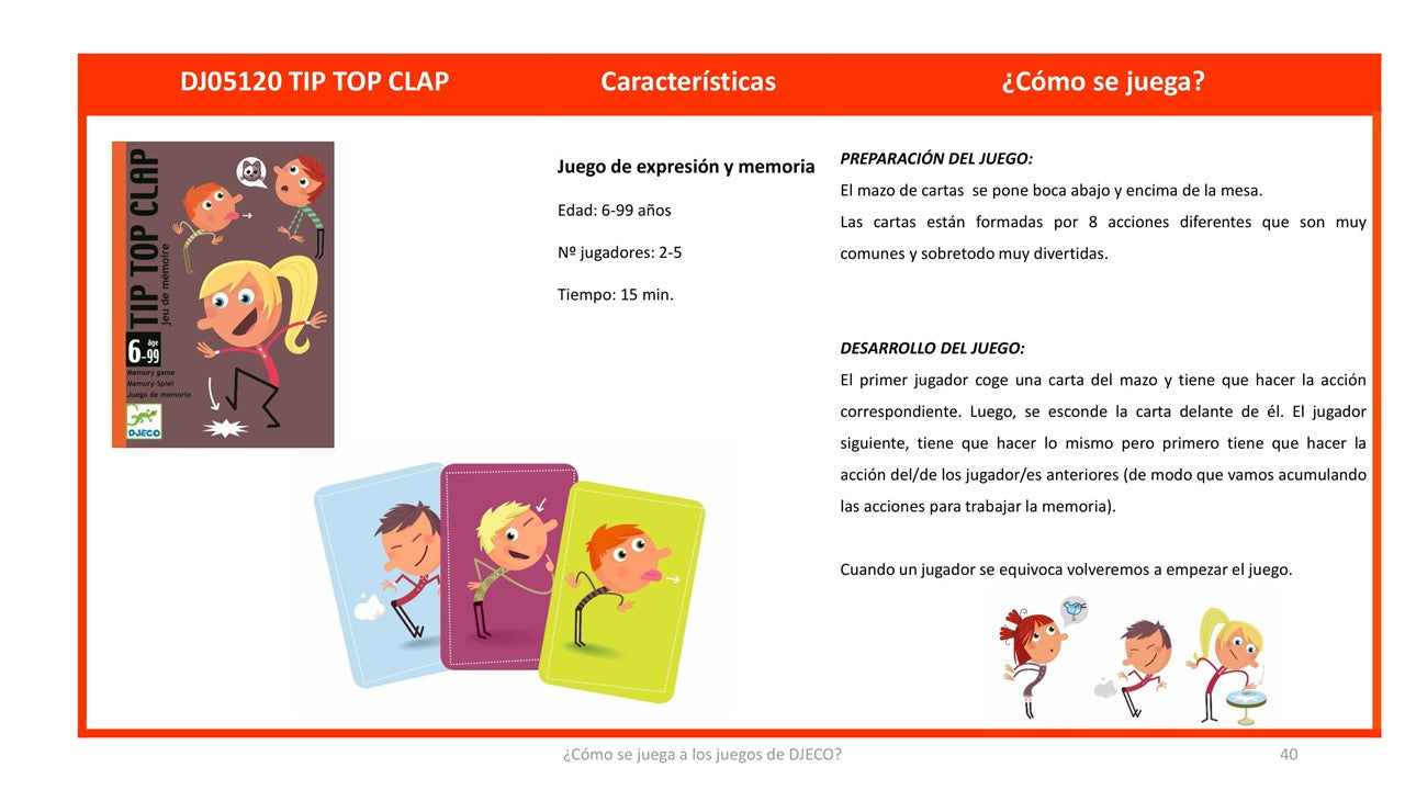 -Un juego de memoria y ambiente en el que hay que concentrarse para memorizar y encadenar los sonidos y gestos indicados en las cartas sacadas sin equivocarse. La secuencia de sonidos y gestos se crea y se alarga a medida que avanza el juego... ¡Las risas están garantizadas!
