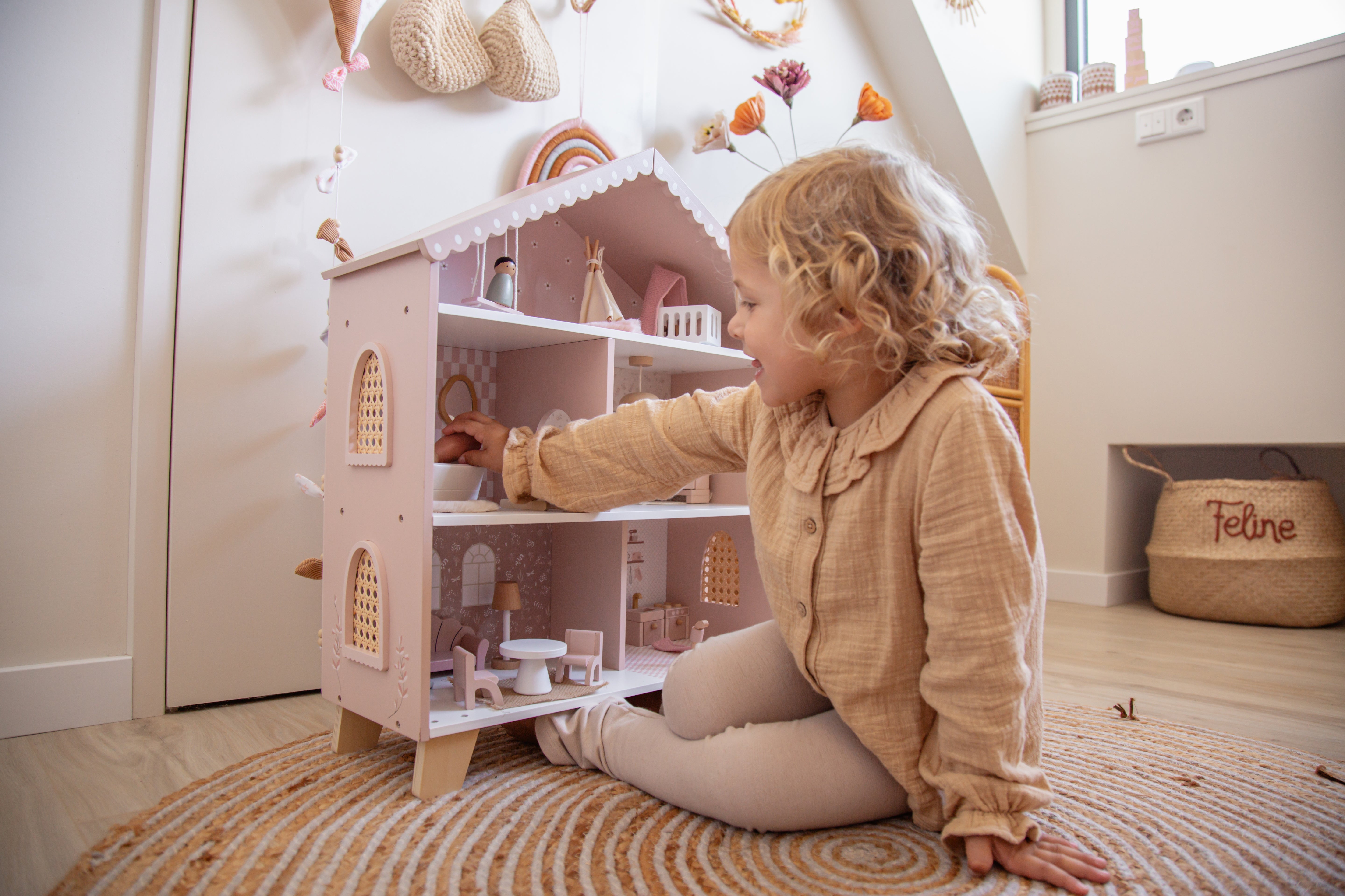 Una casa de muñecas tan hermosa como la habitación donde juega.