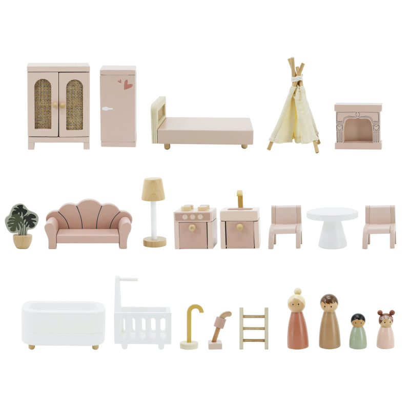 La casa de muñecas incluye todo lo necesario para una diversión sin límites: armario, cama, sofá, cocina, mesa, sillas, bañera, aspiradora y mucho más. También incluye una simpática familia de figuras de madera, listas para entrar a vivir aventuras con tu pequeño.