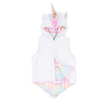 Chaleco de felpa blanca con cuerno de unicornio dorado y detalles en tonos pastel. Forro de cuadros pastel para un toque mágico y cómodo.