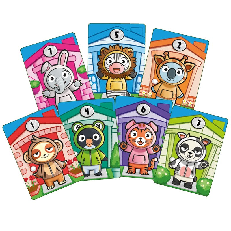 ¡Crea una calle de 7 animales para ganar! Los números de las casas deben ir en orden del 1 al 7. Diviértete con los animales del barrio y sus disfraces, pero cuidado! Que no coincida juntos el mismo animal ni el mismo disfraz!.¡Qué empiece la diversión en el barrio!