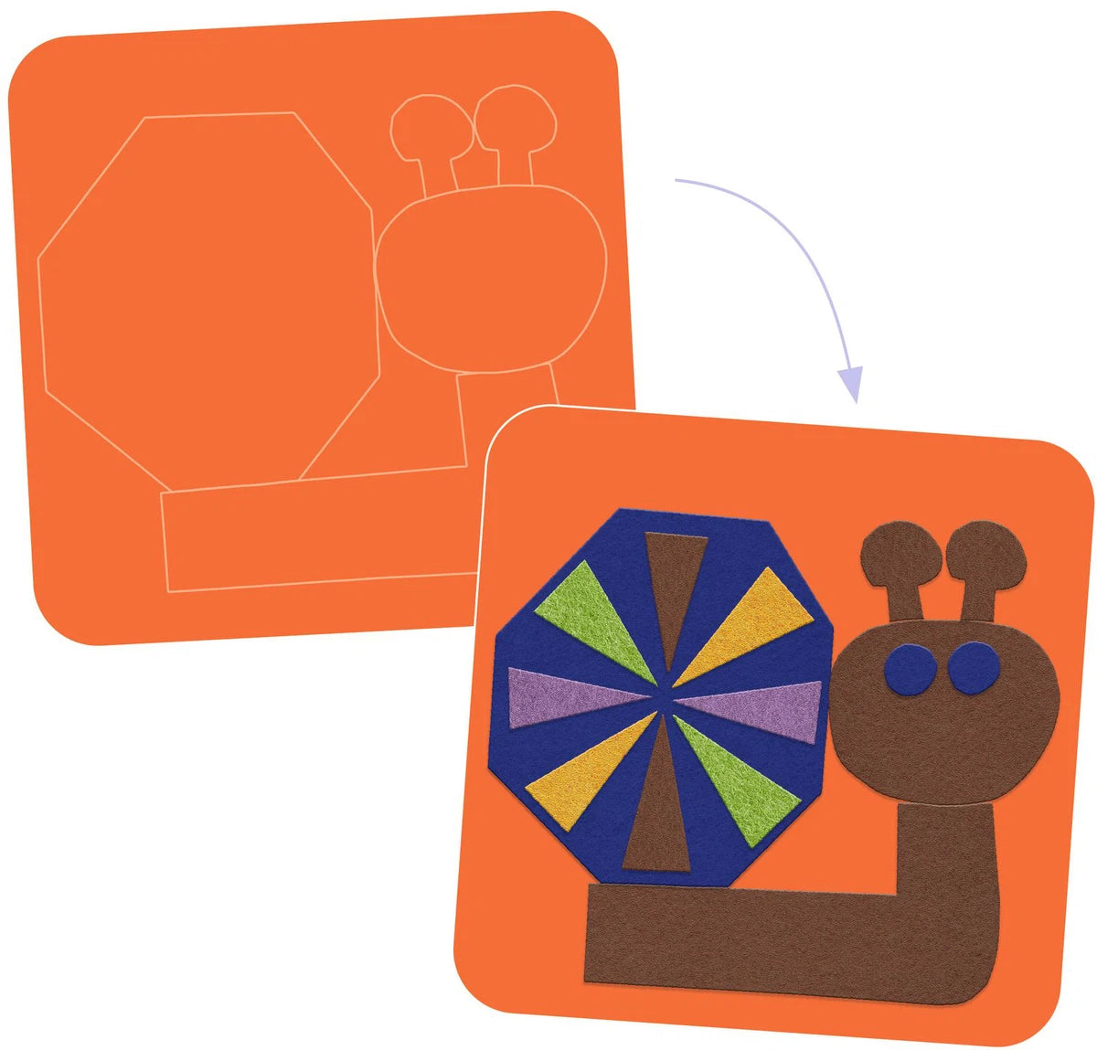 Contenido: cuatro tarjetas ilustradas (20 x 20 cm), 72 pegatinas de fieltro (seis colores) y un folleto explicativo paso a paso. Una actividad para pegar a partir de los 18 meses con la que realizar cuatro tarjetas con pegatinas ultrasuaves de fieltro. Basta con seguir el folleto explicativo e ir pegando las pegatinas de fieltro para crear cuatro suaves tarjetas de colores.