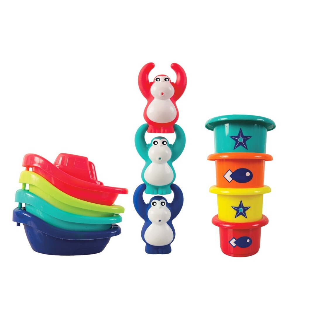 ¡Un pequeño set de baño completo! Compuesto por cuatro barquitos, cuatro vasitos perforados y tres divertidos monos para imaginar aún más aventuras!