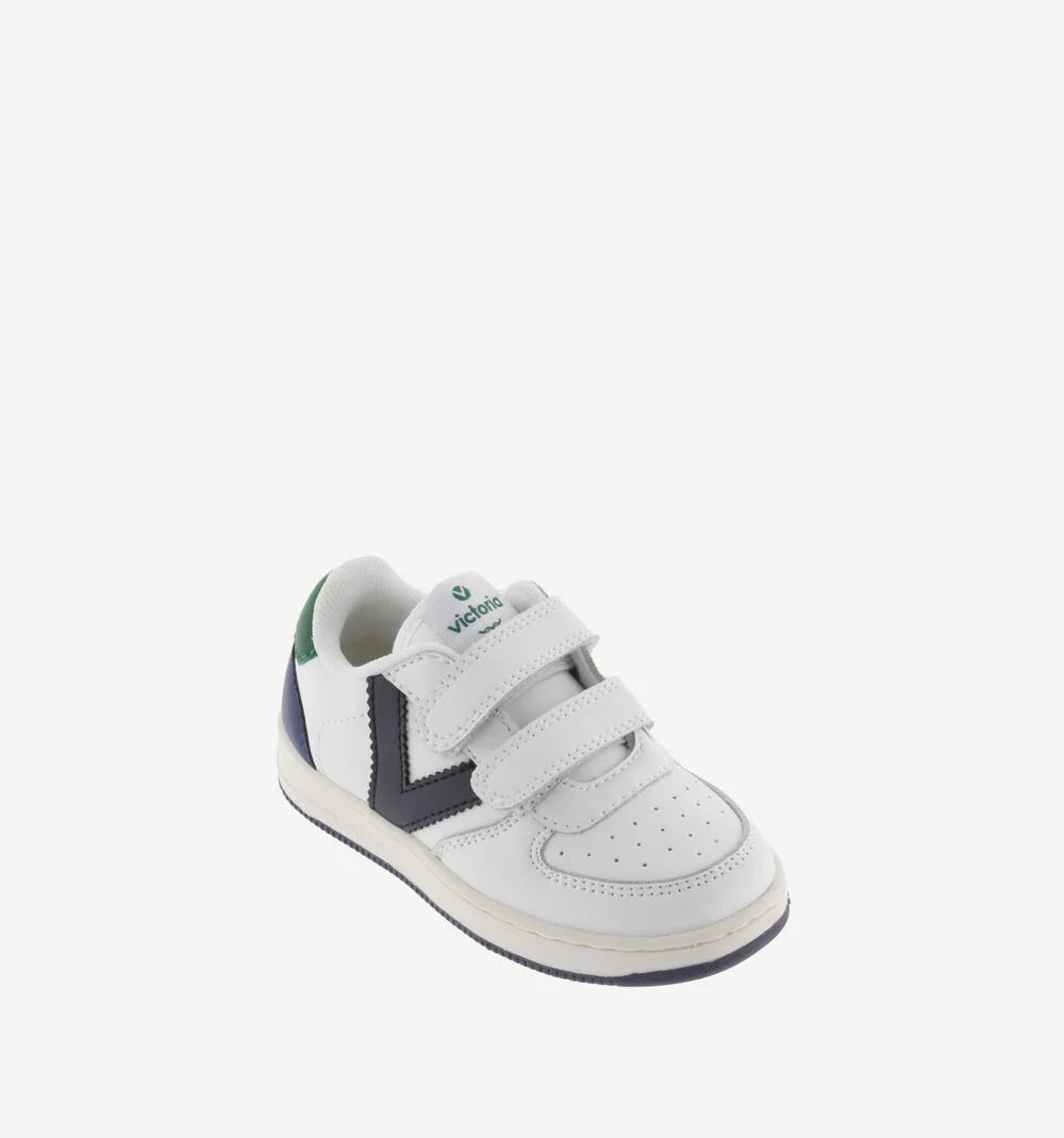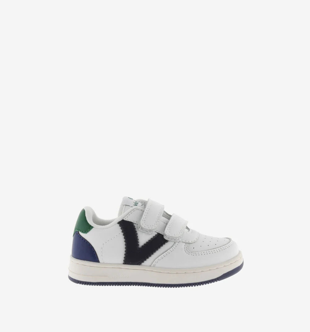 White sneakers for children. Made of leather and split leather effect material. Colored pieces in blue, green and black and two-tone sole with matching detail on the heel. Closure with adhesive strips that facilitate putting on and make them fit perfectly to the foot. It has a perforation on the instep to promote breathability. From size 36 and up, it includes three straps for better support.