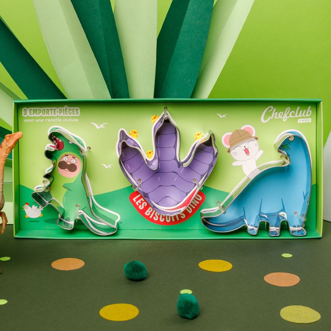 - 3 cortadores de galletas de metal: Tyrannosaurus, Paw Print y Diplodocus.
