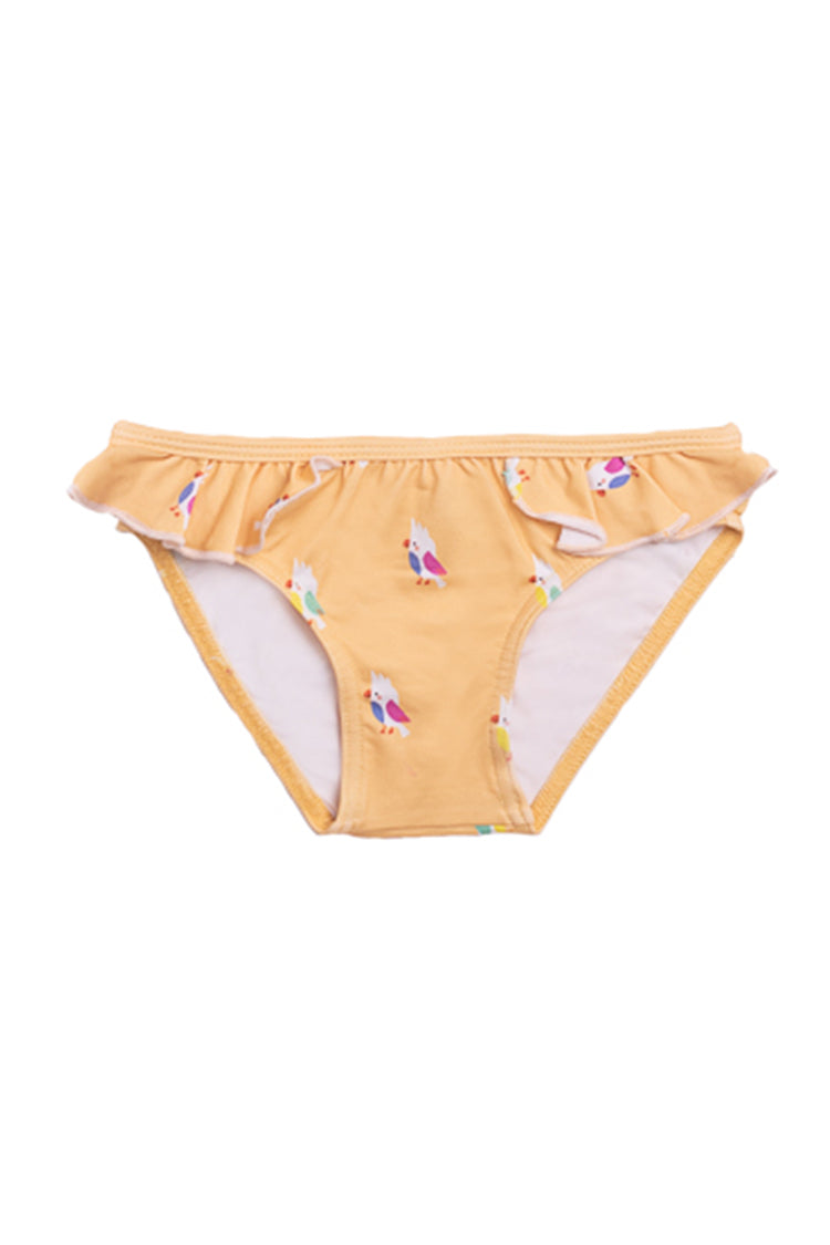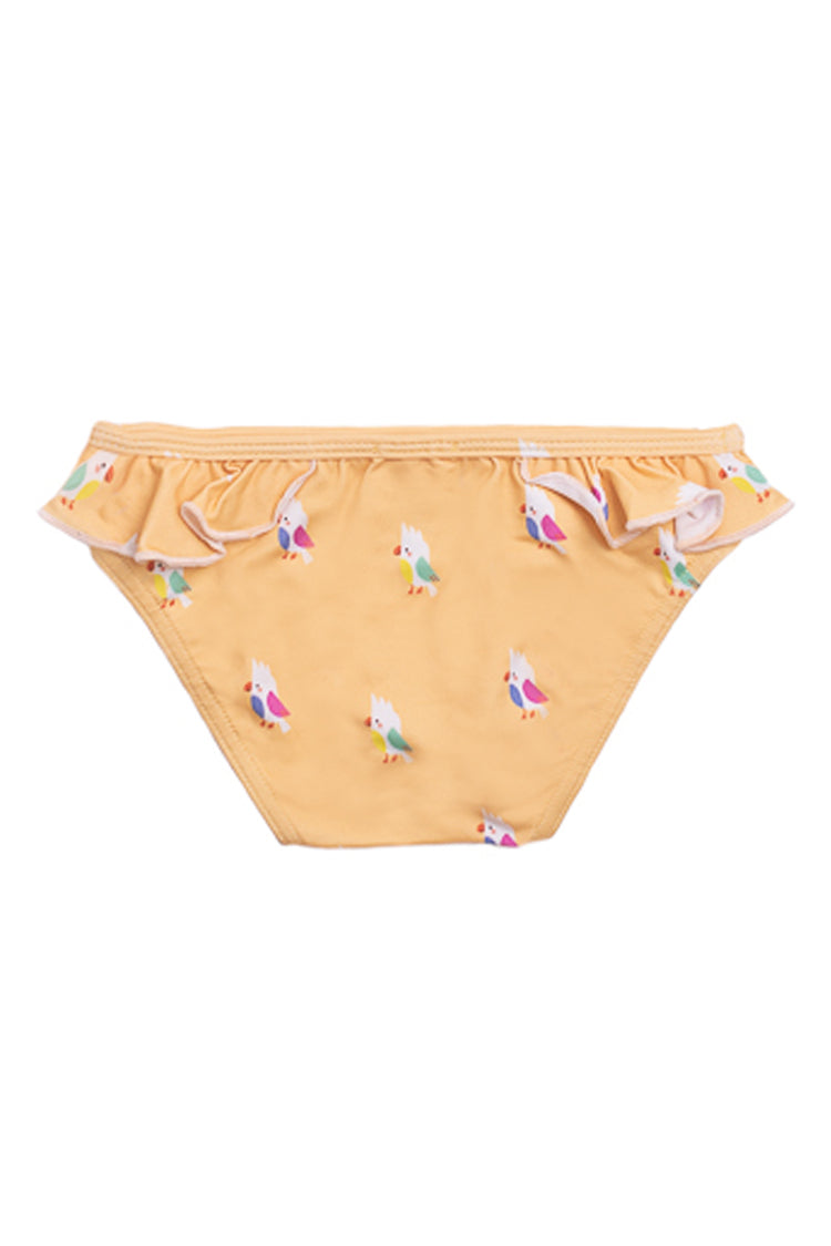Culetín con estampado de cacatúas sobre fondo amarillo. Detalle de volantes laterales rematados en contraste.