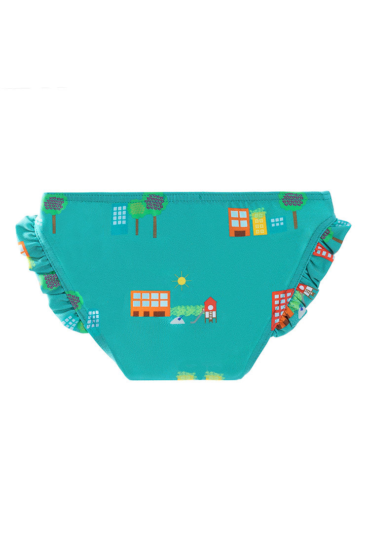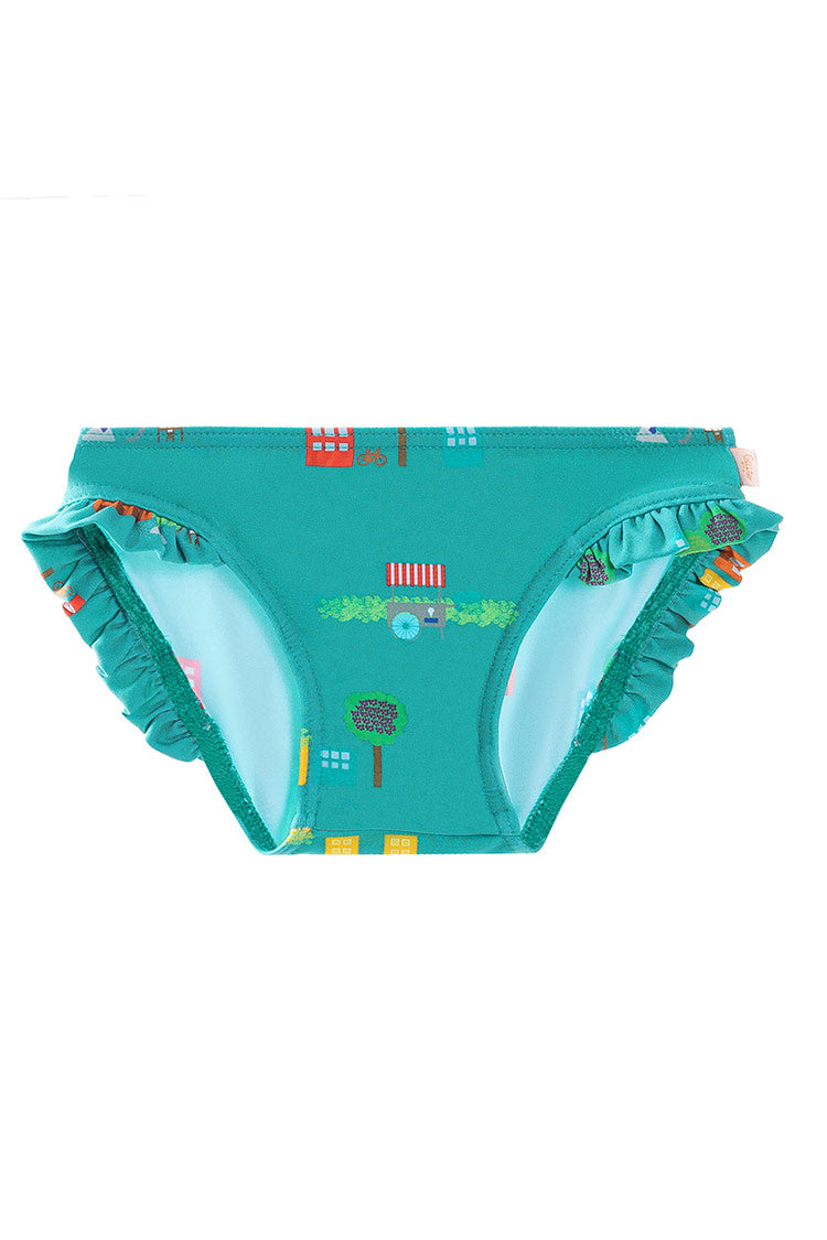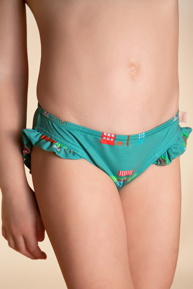 Culetín con estampado de ciudad verano. Diseño exclusivo y propio. Detalle de volantes laterales en las perneras.