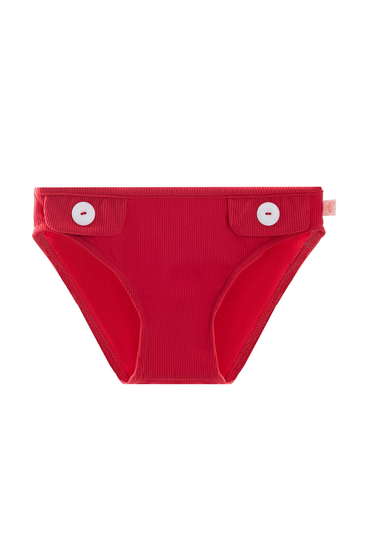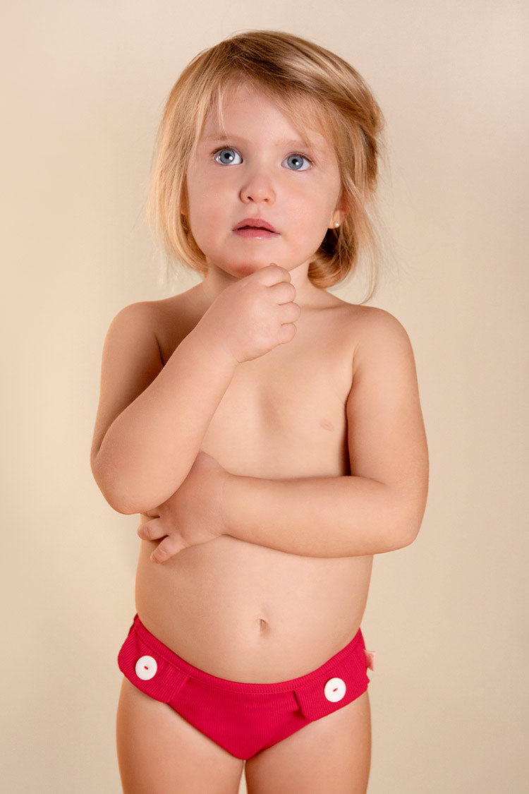 Culetín rojo estilo retro. Detalle de solapas con botones en contraste crudo.
