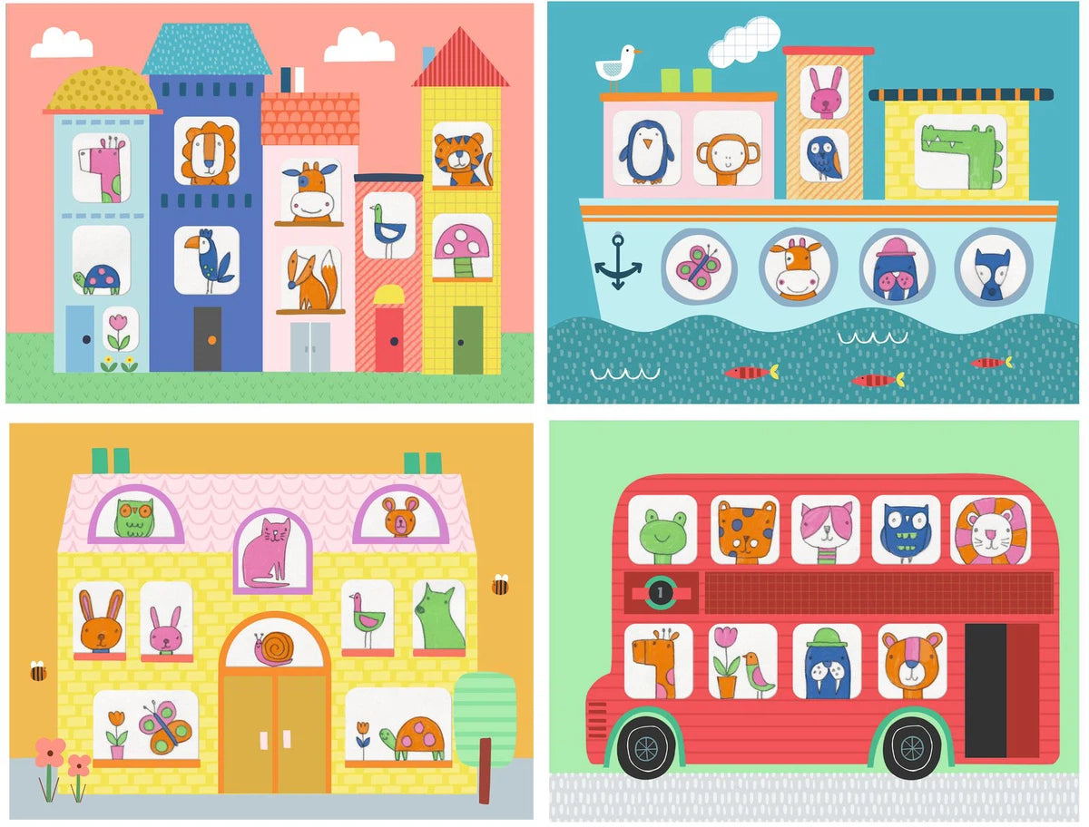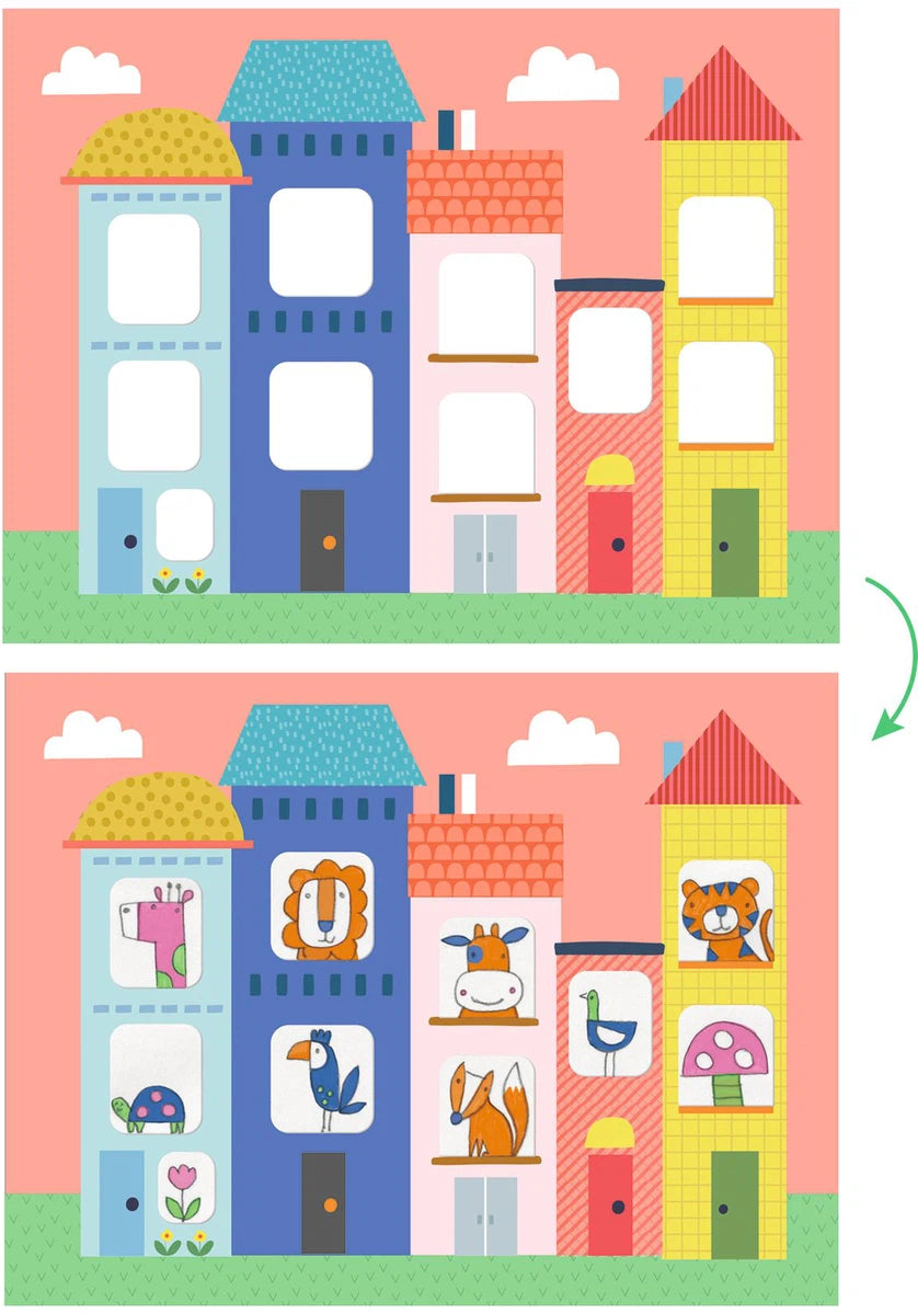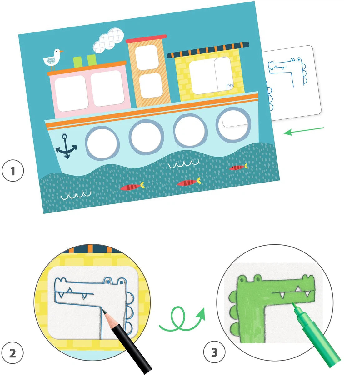 Contenido: 12 hojas ilustradas con calcos (28 x 21 cm), 15 tarjetas de calco (10 x 7 cm), 1 lápiz con goma de borrar, 4 rotuladores (amarillo, rosa, verde y azul) y 1 cuadernillo de explicaciones paso a paso.