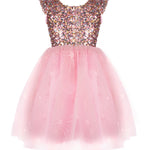 Desde la brillante partre superior fluye una encantadora falda de tul rosa con estrellas brillantes que le dan un toque de fantasía y magia. el suave tul en capas se balancea con cada giro. Confeccionado para pequeñas estrellas que adoran brillar a lo grande.