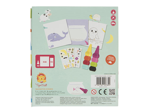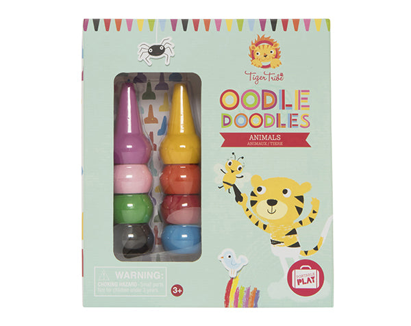 Los juegos de Oodle Doodles están repletos de coloridos crayones apilables y pegatinas diseñadas para mantener felices a los pequeños mientras viajan.
