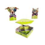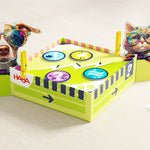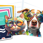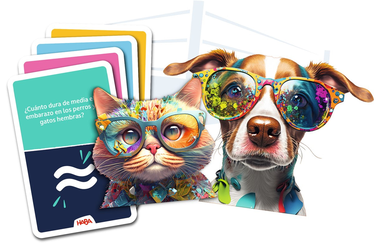 CONTENIDO: 222 cartas con preguntas y respuestas de 4 categorías, 8 cartas de respuestas (4 de perros y 4 de gatos), 1 cuadrilátero (base de la caja del juego con una cuadrícula compuesta por 3 piezas y 1 tablero) y 2 mascotas, 4 fichas redondas de colores, 2 pinzas de la ropa, 1 instrucciones del juego