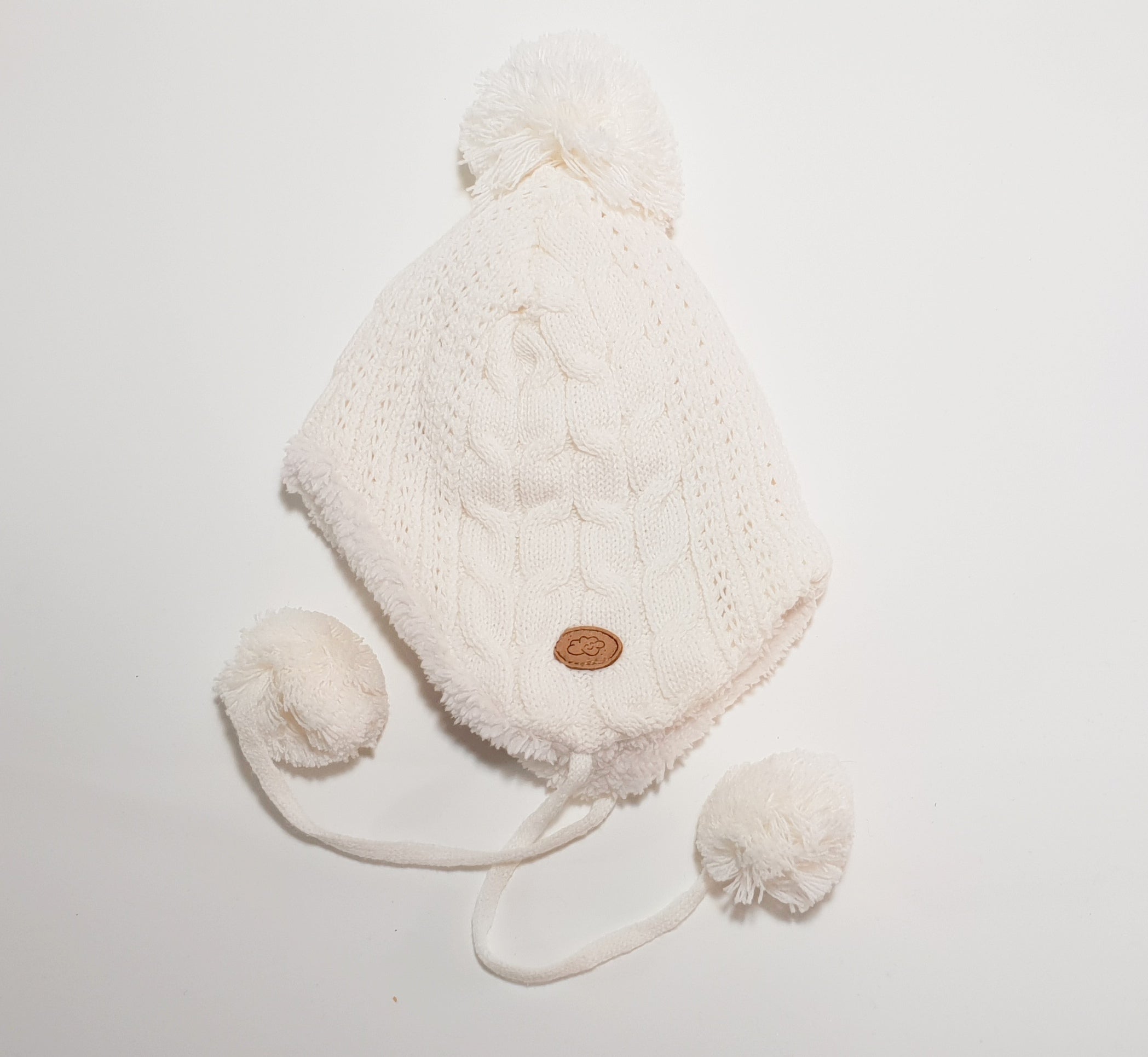 Un estilo muy actual de gorro con orejeras tejido con trenzas y pompones para atar