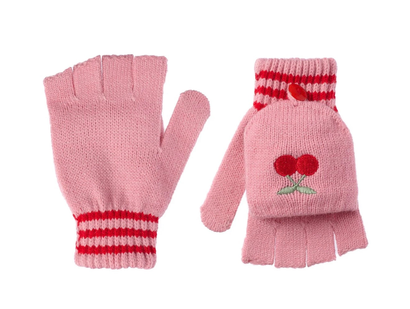 Aporta un toque de color a los días fríos con nuestros alegres guantes de punto con cerezas. Decorados con brillantes cerecitas rojas, estos guantes sin dedos cuentan con una capucha forrada en tejido polar para mayor calidez, que puede sujetarse con un botón cuando no se usa, y con el pulgar totalmente cubierto para mayor comodidad.