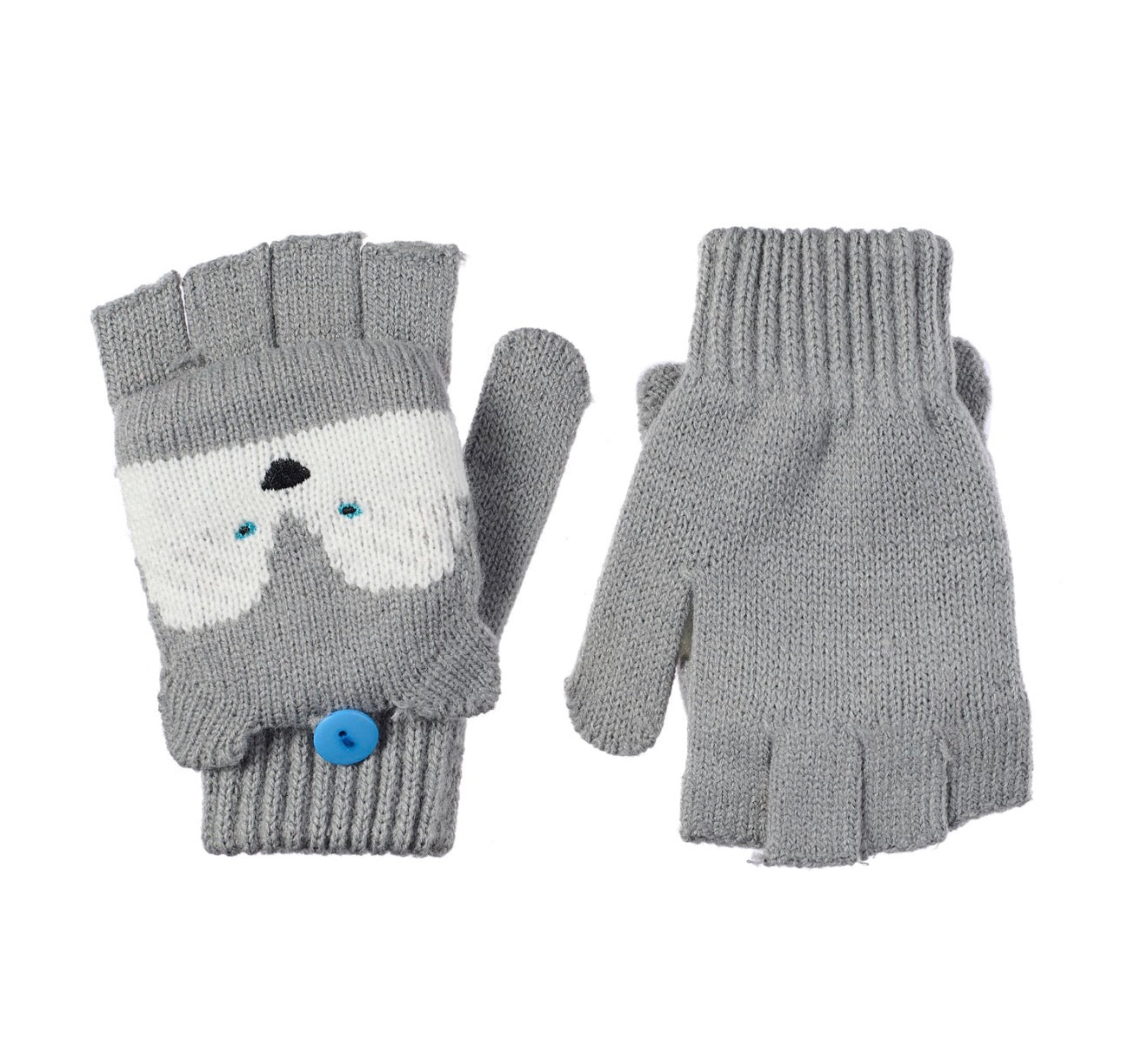 ¡Nuestros guantes Husky Dog son el mejor amigo para mantener las manitas calentitas este invierno! Tejidos con hilo súper suave en gris y blanco, lucen una adorable carita bordada y pequeñas orejitas de terciopelo. Estos guantes sin dedos incluyen además una capucha forrada en tejido polar, que puede sujetarse con un botón cuando no se usa, y un pulgar totalmente cubierto para mayor calidez.