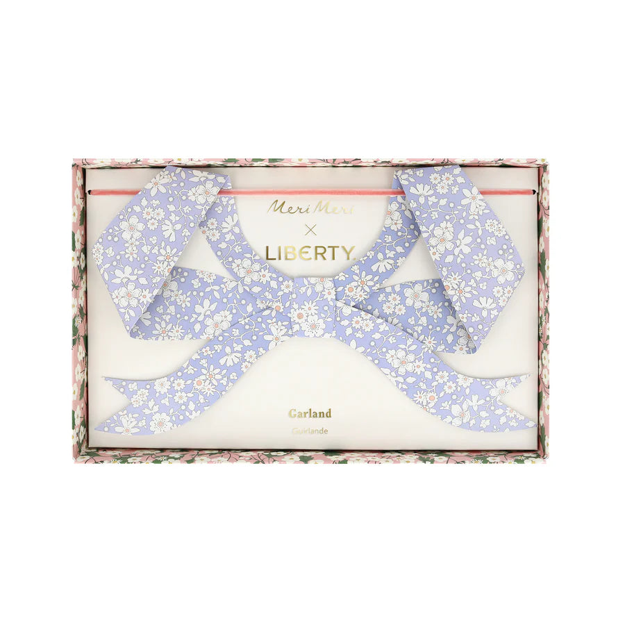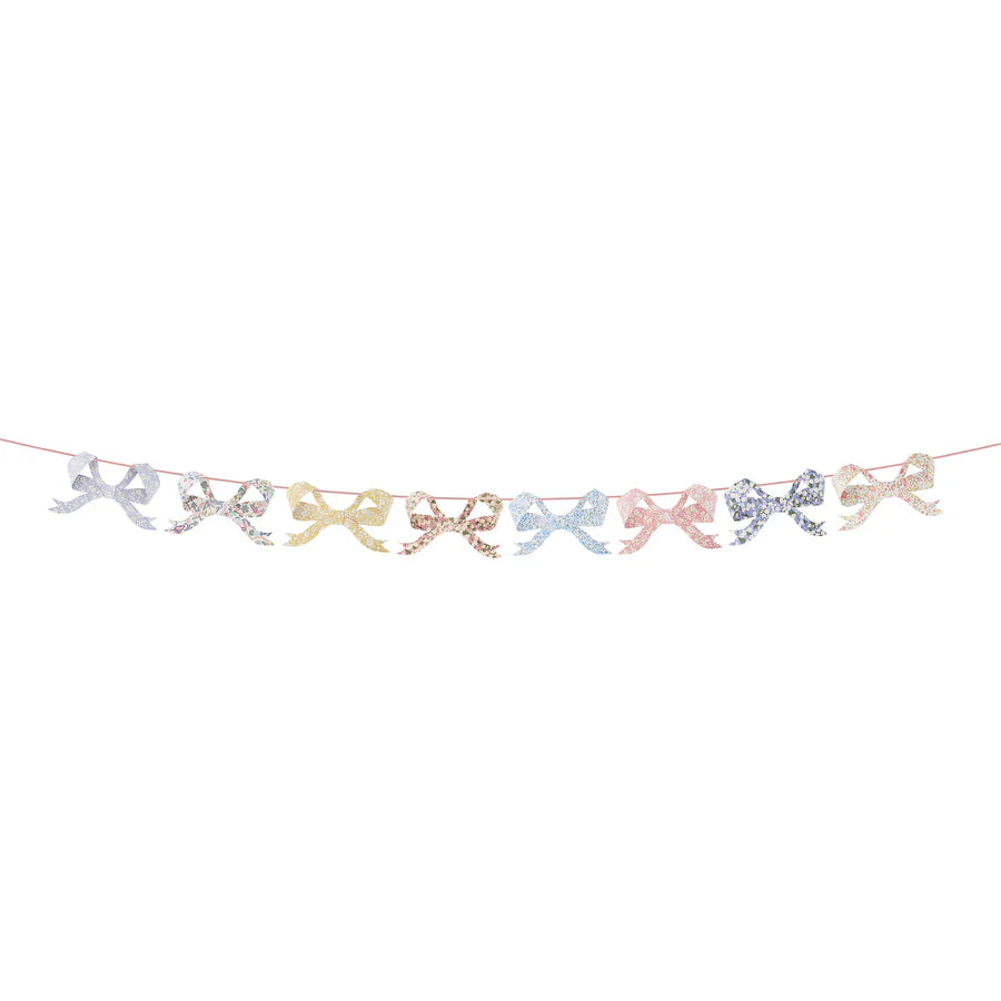 Los lazos siguen estando de moda, así que esta es la combinación perfecta de decoración estampada con un toque moderno. Ocho banderines de lazos, con diseños florales de Liberty, están ensartados en una cinta de terciopelo rosa empolvado.