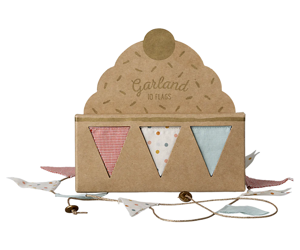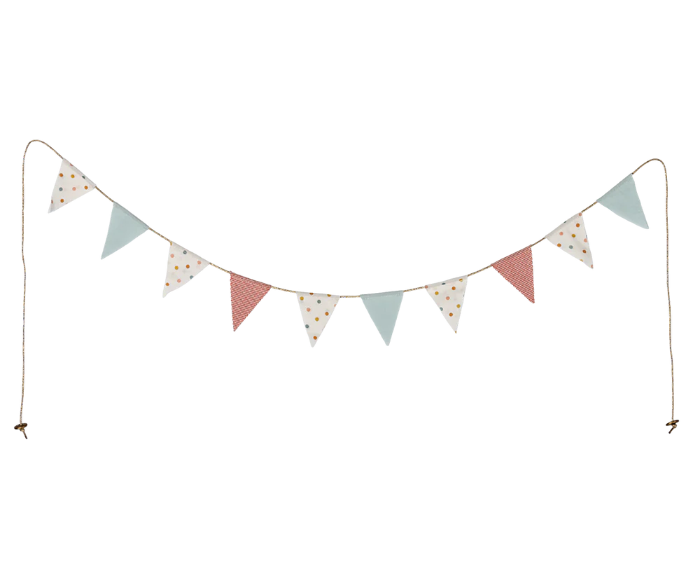 Una nueva guirnalda con banderines realizada en tela Maileg. Perfecto para cualquier lugar de la habitación de los niños. Contiene 10 banderas y 2 monedas con logo en los extremos. La longitud es de 115 cm.