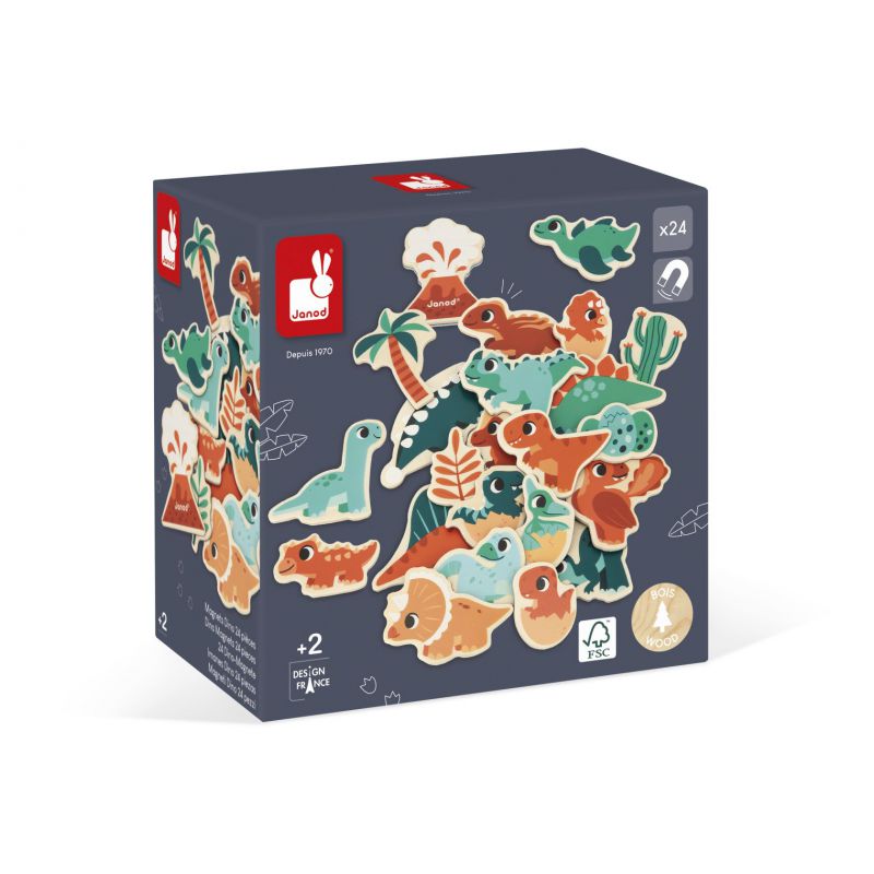 ¡Embárquese en un viaje a través del tiempo en el mundo de los dinosaurios con nuestros imanes Dino! Se pueden imaginar bonitas historias con el Spinosaurus, el Stegosaurus, el Pteranodon y todos los demás. Este kit está compuesto por 24 imanes de madera que se pueden colocar en pizarras magnéticas, o cualquier otra superficie magnética. De esta forma, su hijo podrá desarrollar su imaginación y su destreza mientras se divierte. Juguete de madera FSCTM. Para niños a partir de 2 años.