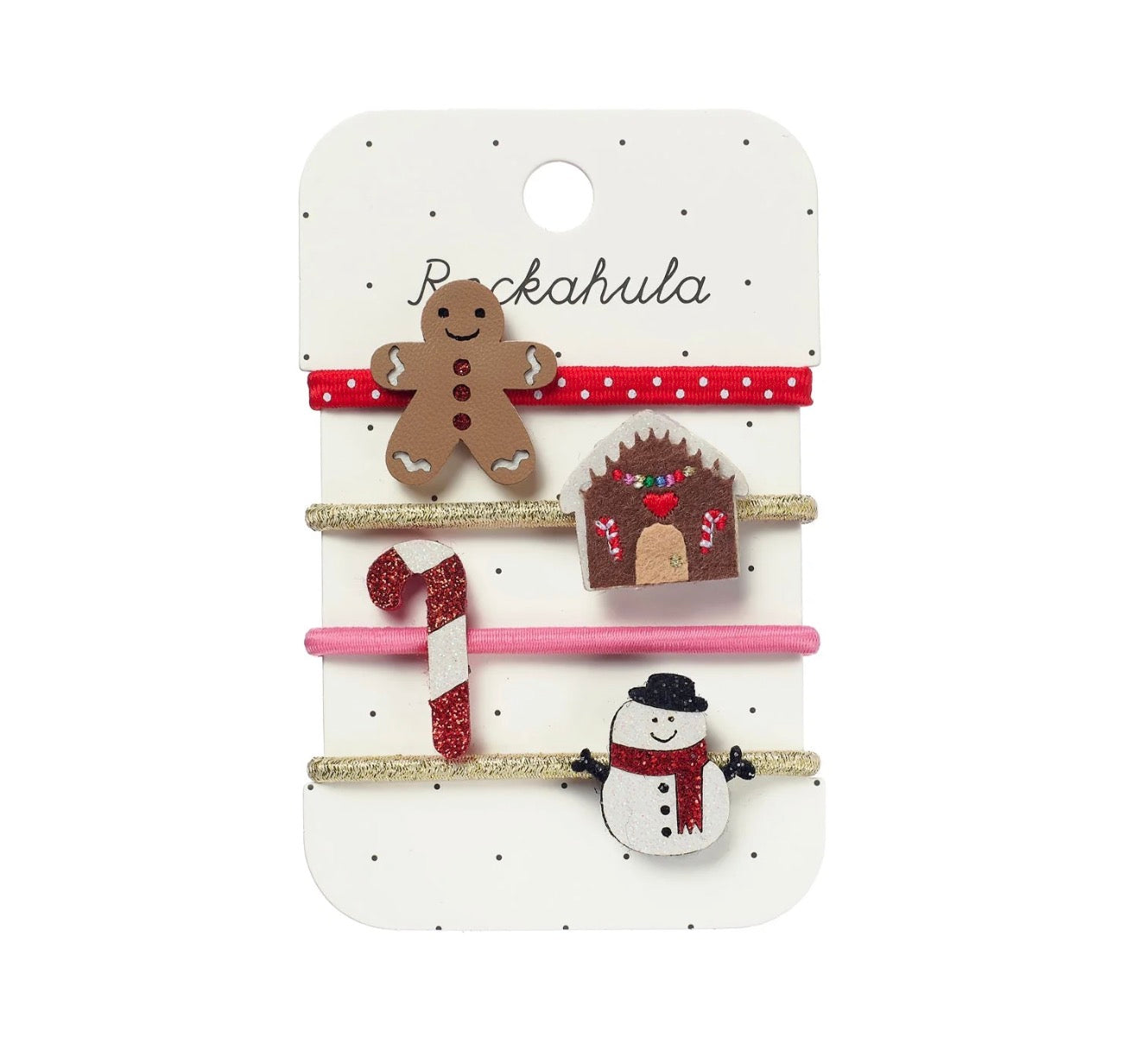 ¡Da un paso dentro de nuestro maravilloso mundo navideño con este divertido pack de cuatro coleteros! Incluye nuestro adorable hombrecito de jengibre, un bastón de caramelo brillante, una casita de jengibre y un dulce muñeco de nieve con destellos. Puedes llevarlos uno a uno… ¡o aún mejor, todos a la vez!