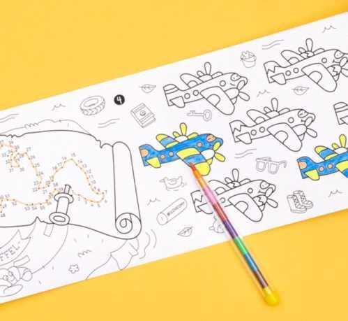 Este ingenioso juego de bolsillo de 1 metro de largo, lleno de pistas, actividades y colorantes + 1 crayón multicolor.