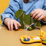 ¡Enhebra y cose con la Sra. Elefante y sus amigos! Este ingenioso juego de cordones es perfecto para que los pequeños practiquen la coordinación óculo-manual y su motricidad fina mientras enhebran y decoran cada animal con cordones de colores y cuentas de madera. Próxima parada, ¡atarse los cordones de los zapatos! Fabricado con madera 100 % con certificación FSC® y pinturas no tóxicas y seguras para los más pequeños.