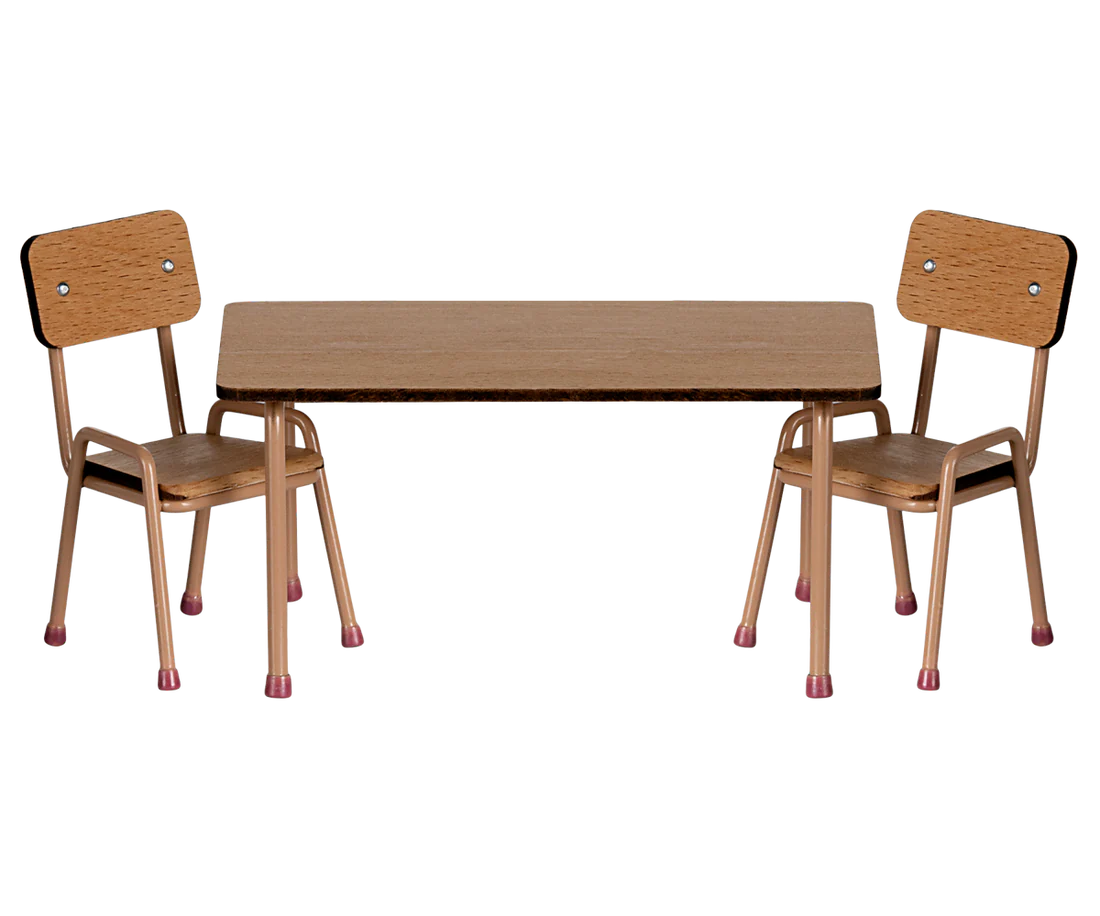 Juego de mesa y sillas que se adapta a Mouse Hole Farmhouse. Está fabricado en madera de haya con patas de metal. Observe los detalles de color hechos a mano en los pies de las patas, tanto en la mesa como en las sillas. El conjunto viene con 2 sillas.