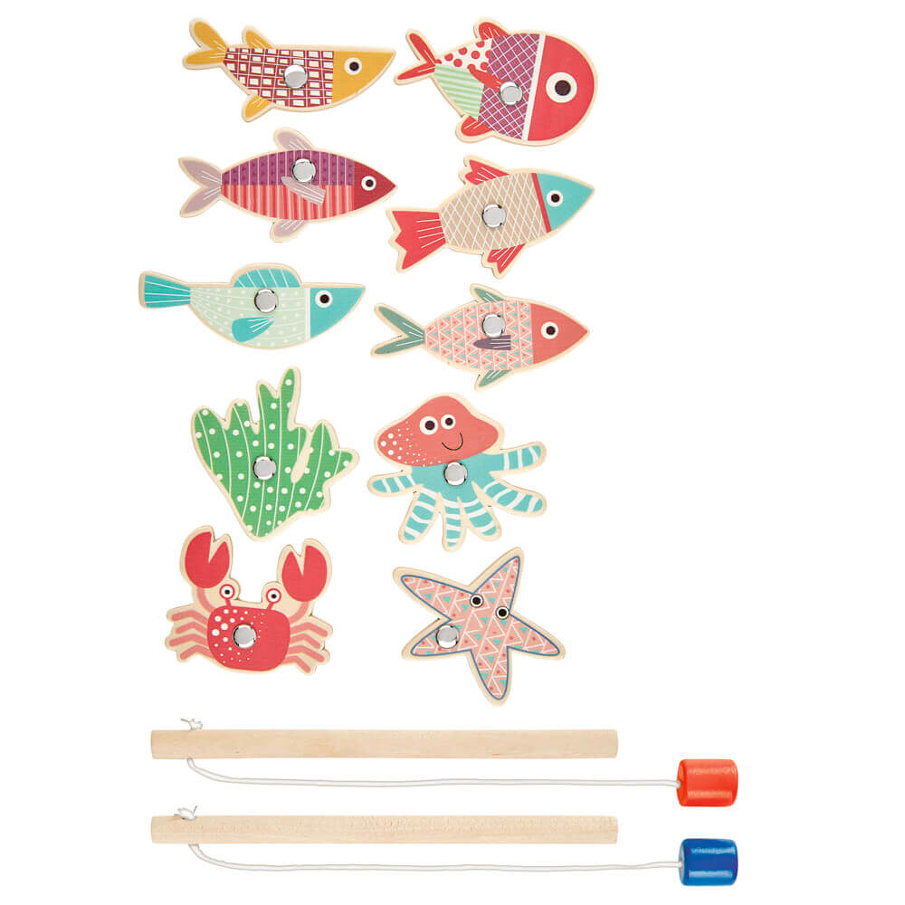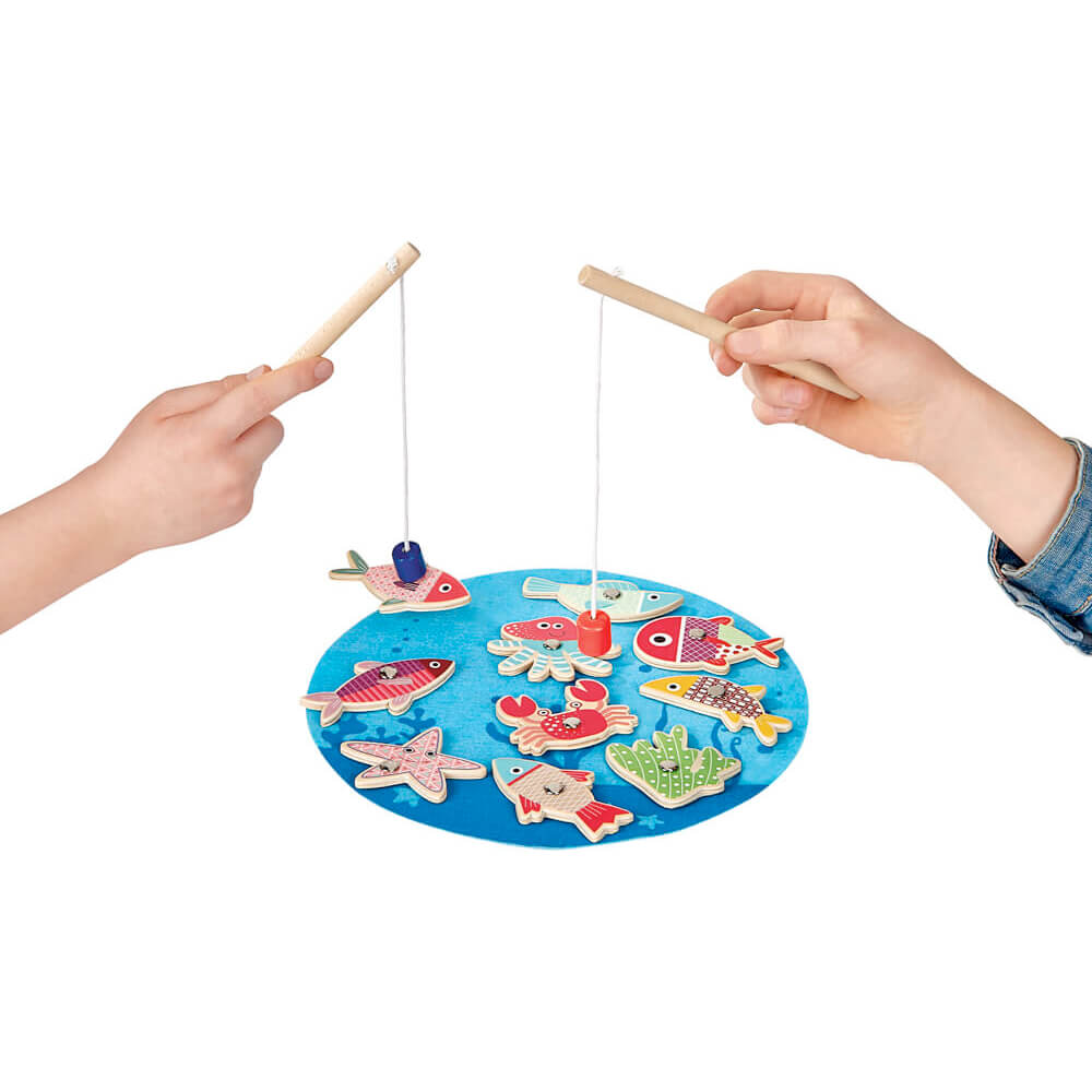 Contiene: 10 criaturas marinas magnéticas y 2 cañas de pescar de madera, 1 océano de tela y juego de instrucciones.